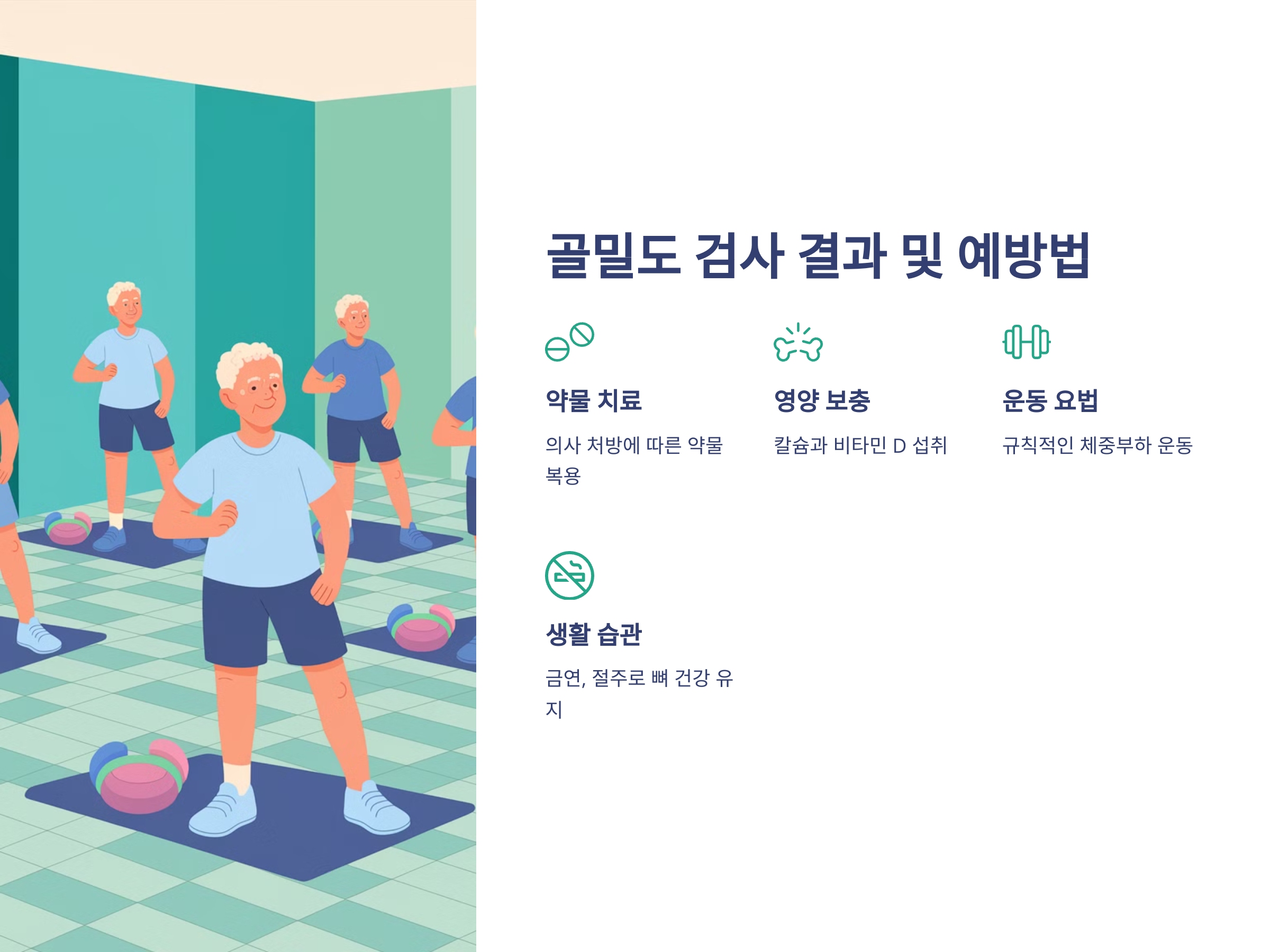 골밀도 검사를 통해 결과를 확인한 후, 골다공증이 확인되면 추가적인 치료가 필요할 수 있습니다. 치료에는 약물 치료, 생활 습관 개선, 칼슘과 비타민 D 보충 등이 포함될 수 있습니다. 또한, 골밀도 검사를 통해 골다공증이 진행된 정도를 확인한 후에는, 골절을 예방하기 위한 운동 요법과 식습관 개선이 필요합니다.