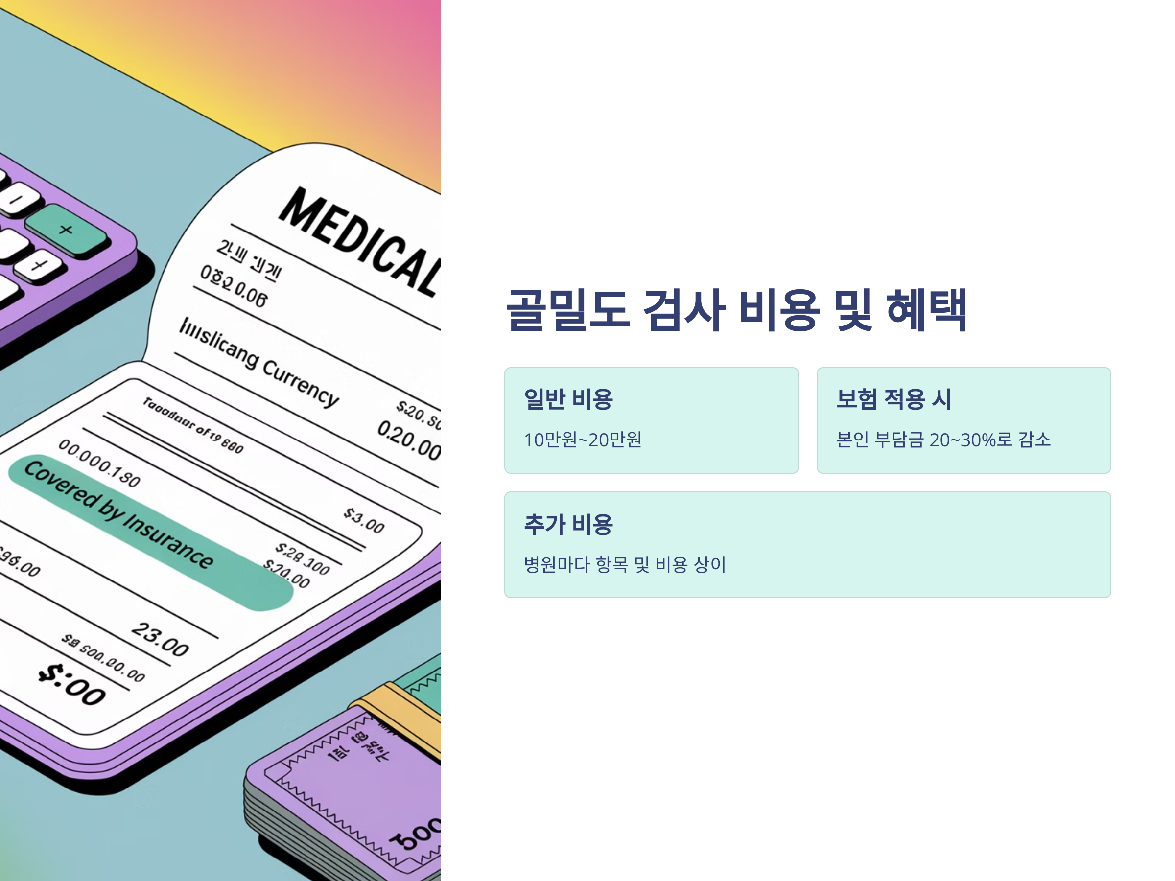 골밀도 검사의 비용은 병원에 따라 다르지만, 대체로 10만 원에서 20만 원 사이입니다. 하지만 건강보험이 적용되면 일부 비용을 지원받을 수 있어 본인 부담금이 줄어듭니다. 예를 들어, 고위험군에 해당하는 경우, 건강보험이 적용되어 검사를 받는다면, 본인 부담금은 약 20~30% 정도로 줄어들게 됩니다.