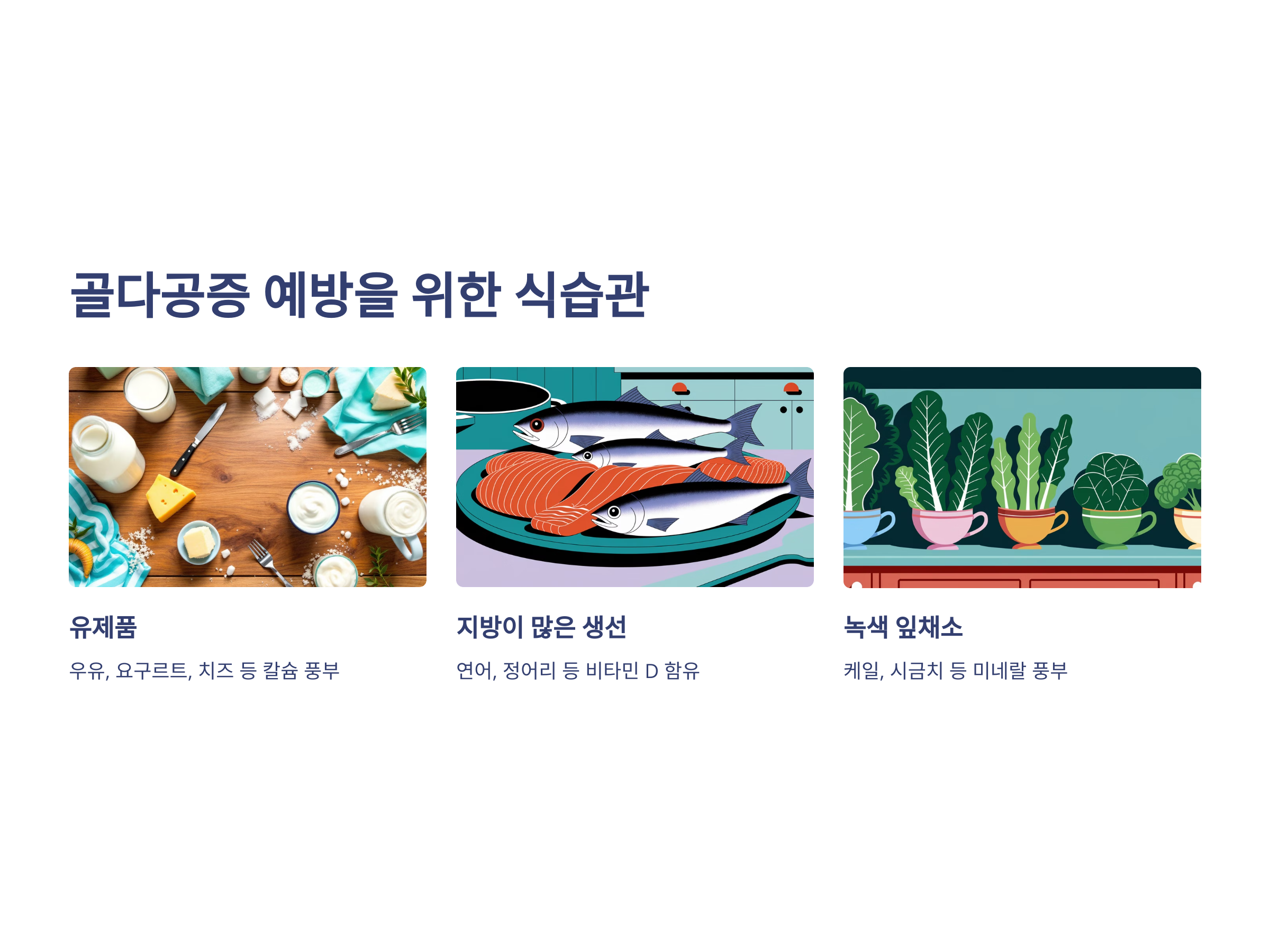 특히, 골다공증 예방을 위해서는 적절한 칼슘과 비타민 D를 섭취하고, 규칙적인 운동을 통해 뼈의 건강을 유지하는 것이 중요합니다. 또한, 흡연과 과도한 음주는 골다공증을 악화시킬 수 있으므로 이를 피하는 것이 좋습니다.