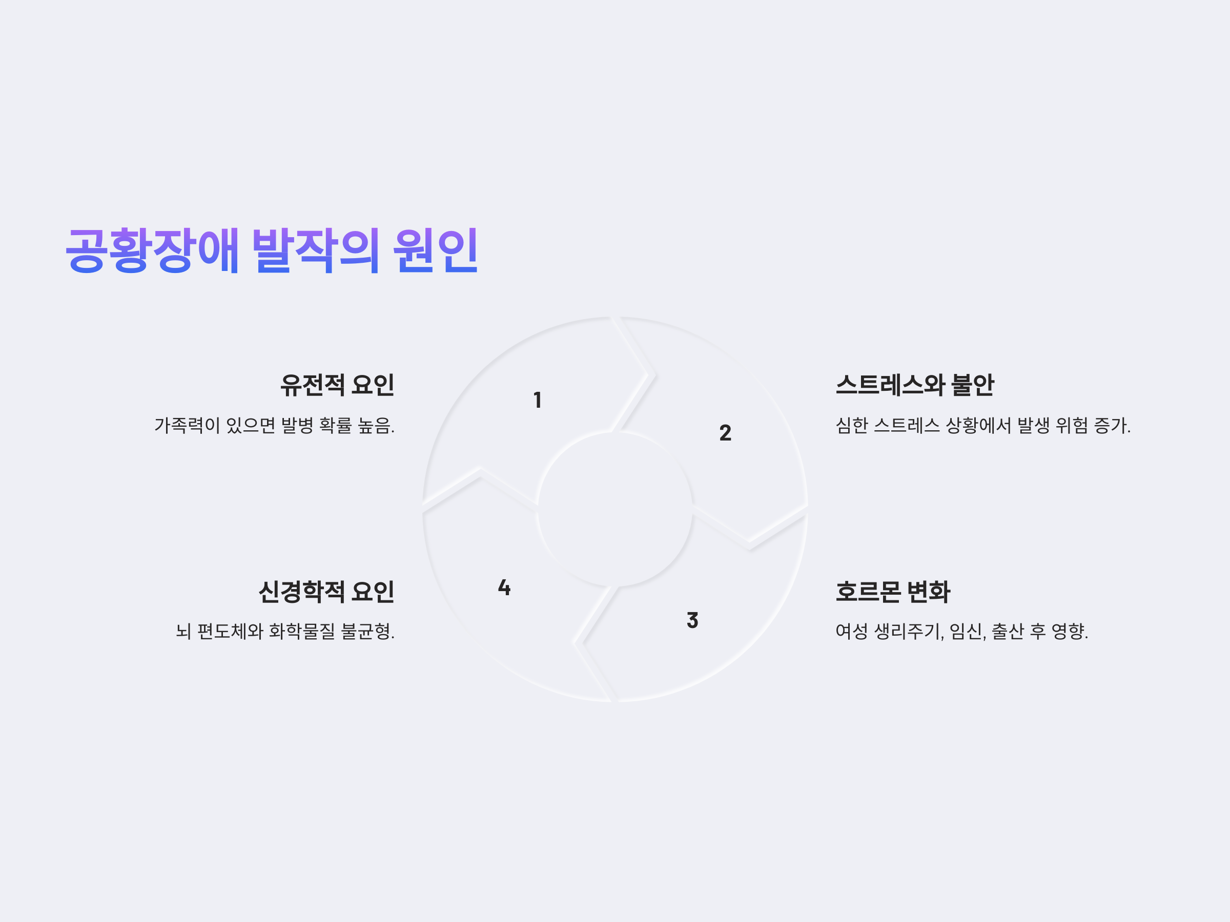 또한, 호르몬 변화도 중요한 역할을 합니다. 특히 여성의 경우 생리 주기나 임신, 출산 후 호르몬 변화가 공황장애 발작을 유발할 수 있는 중요한 원인 중 하나입니다. 스트레스나 감정적 불안정이 심한 상황에서도 이러한 발작은 더 빈번히 발생할 수 있습니다.