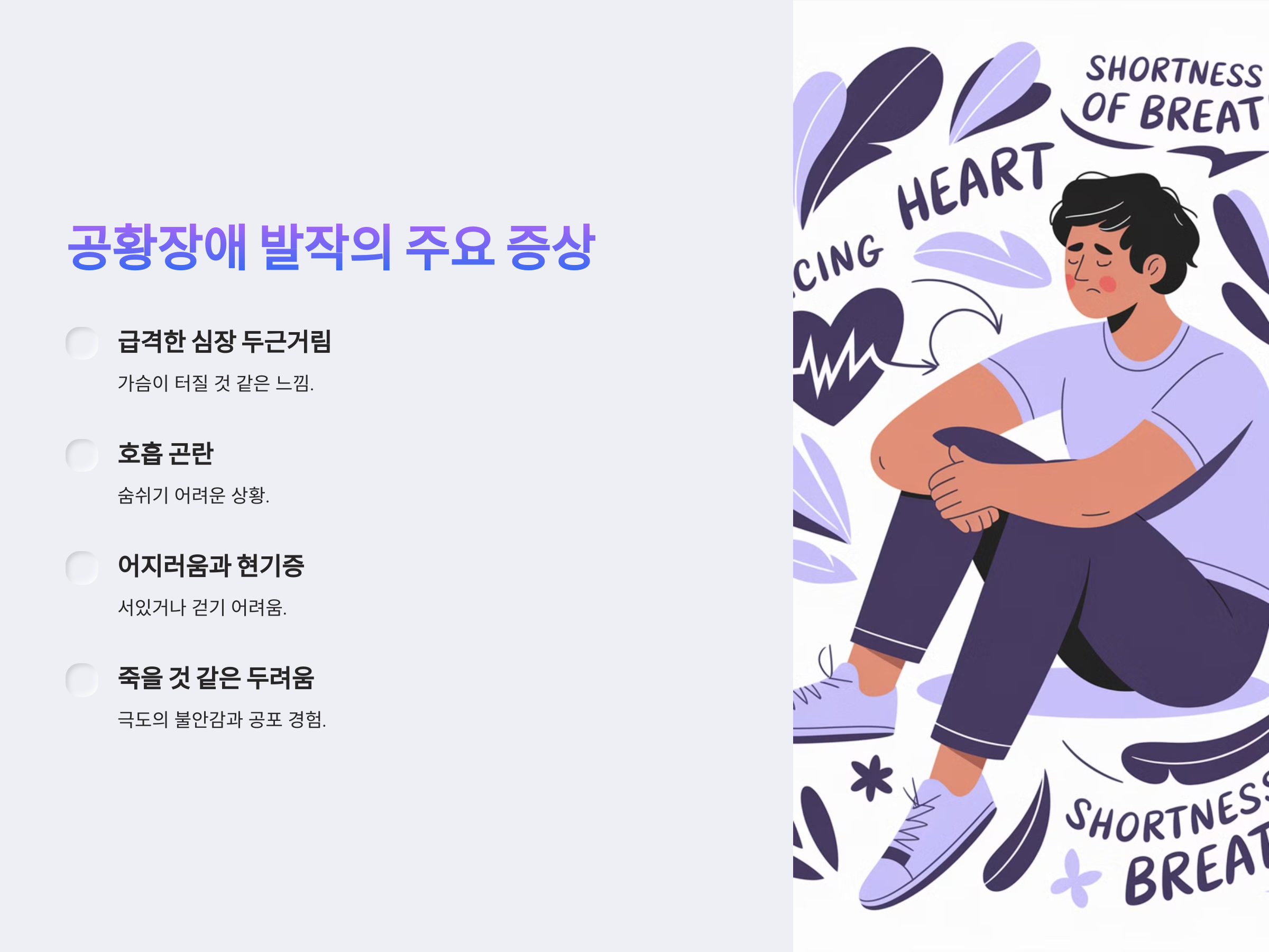 공황장애 발작은 예기치 않게 일어날 수 있으며, 그 증상은 때로 매우 두려움을 느끼게 합니다. 공황장애를 경험하는 사람들은 가슴이 두근거리거나 숨쉬기 어려운 상황을 겪기도 하며, 이는 종종 공황 발작으로 이어집니다. 이런 증상이 일어나면 당황하고 불안해할 수 있지만, 이에 대해 잘 알고 대처한다면 훨씬 더 나은 관리가 가능합니다. 공황장애 발작의 증상은 사람마다 다를 수 있지만, 대표적인 증상들에 대해 정확히 알아두는 것이 중요합니다. 오늘은 공황장애 발작의 주요 증상과 그것에 대한 대처 방법을 소개하려고 합니다.