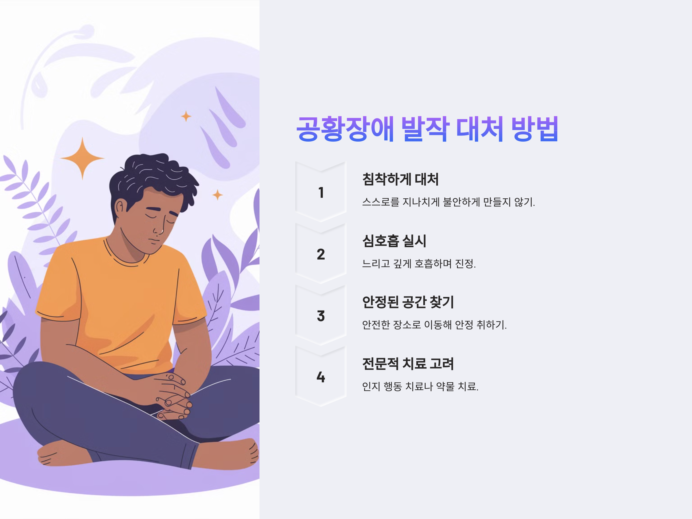 공황장애 발작이 발생하면 가장 중요한 것은 침착하게 대처하는 것입니다. 발작을 겪을 때, 스스로를 지나치게 불안하게 만들지 않도록 주의해야 합니다. 첫 번째로 중요한 것은 심호흡입니다. 발작 중에는 호흡이 어려워지기 때문에, 느리고 깊게 호흡하며 자신을 진정시키는 것이 매우 중요합니다. 긴장을 풀고 자신의 호흡을 차분하게 되찾는 것이 증상을 완화하는 데 큰 도움이 됩니다.
