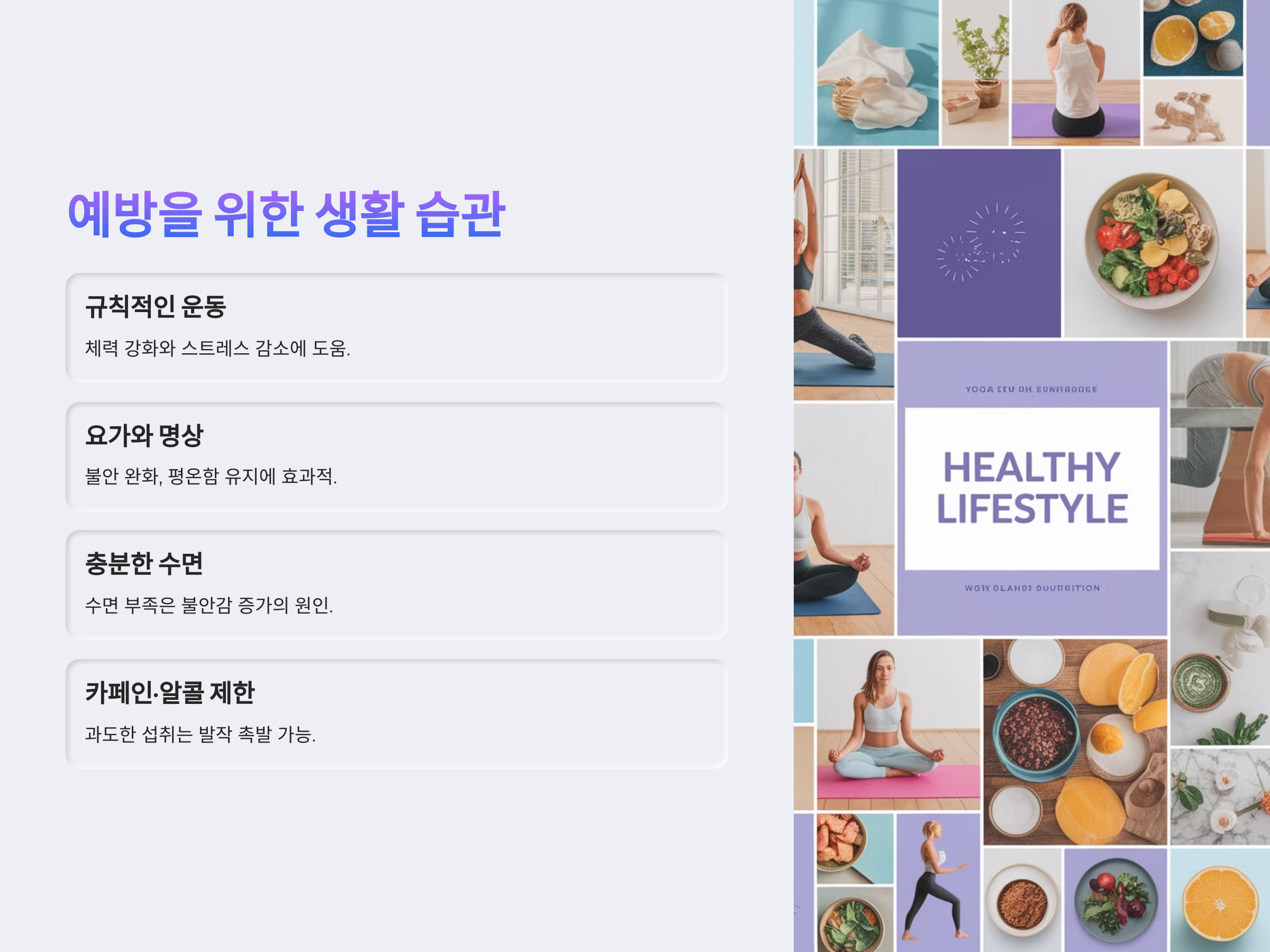 공황장애 발작을 예방하려면, 일상적인 생활에서 스트레스 관리가 매우 중요합니다. 우선, 규칙적인 운동을 통해 체력을 강화하고 스트레스를 줄이는 것이 좋습니다. 운동은 신체뿐만 아니라 정신적인 안정에도 매우 긍정적인 영향을 미칩니다. 특히, 요가나 명상은 불안을 완화하고, 평온함을 유지하는 데 도움을 줄 수 있습니다.