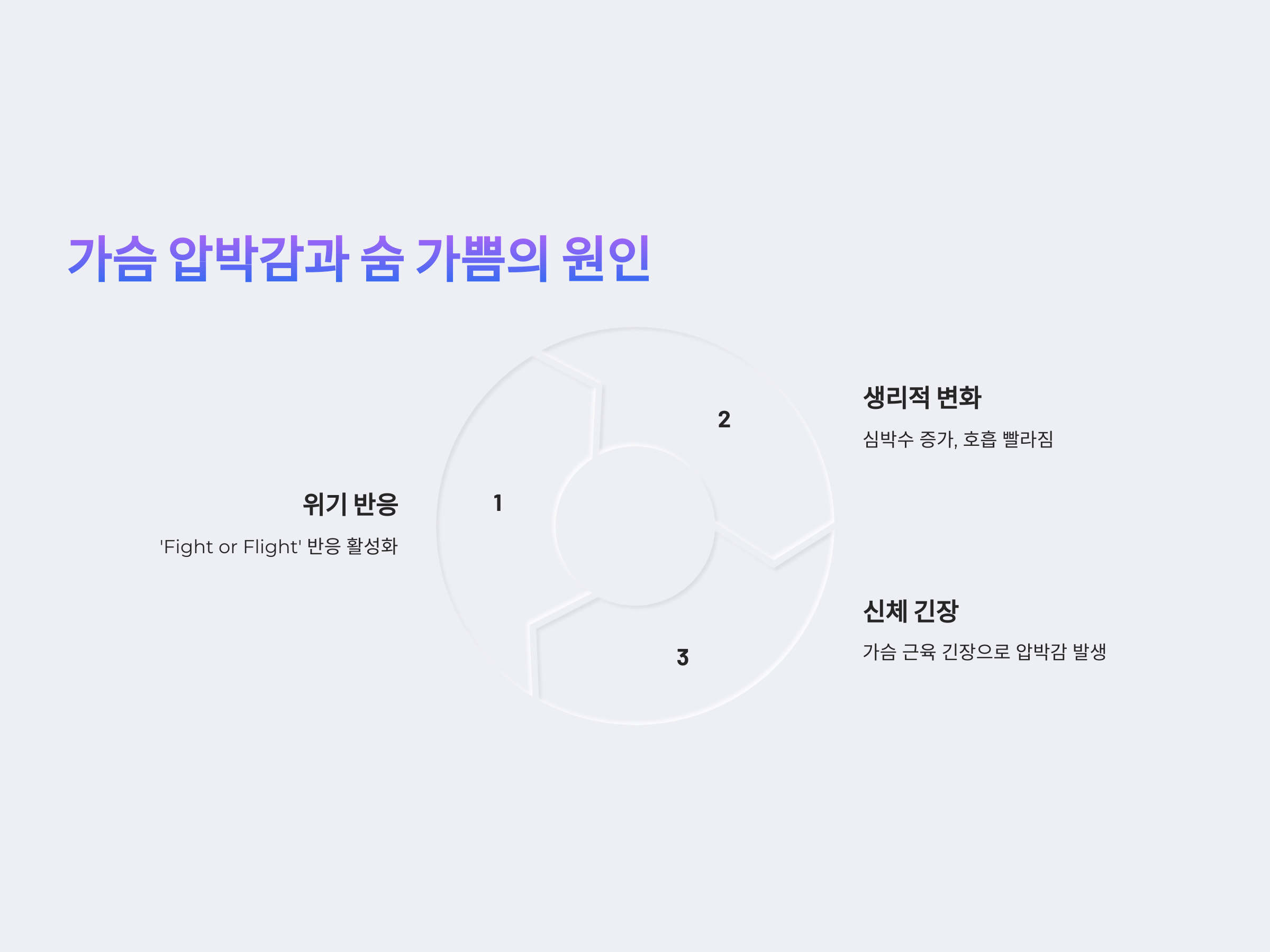 가슴 압박감과 숨 가쁨은 공황 발작의 가장 흔한 증상으로, 그 원인은 주로 신경계의 과도한 반응에 있습니다. 공황 발작이 일어날 때, 몸은 'fight or flight' 반응을 활성화합니다. 이는 생리적으로 몸이 위험에 처한 상황에서 도망가거나 싸우기 위해 준비하는 반응으로, 심박수가 급격히 증가하고 호흡이 빨라지며, 근육에 에너지가 집중됩니다. 이때, 가슴에 압박감이나 숨 가쁨을 느끼는 것은 신체의 스트레스 반응 때문입니다.