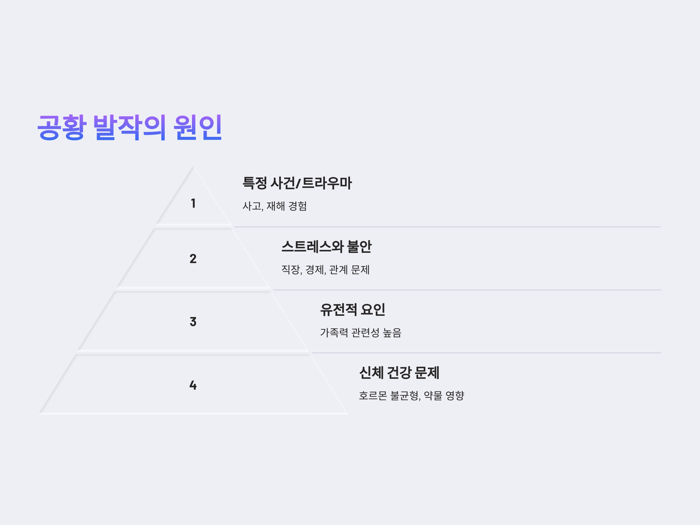 어떤 사건이나 경험이 트라우마로 작용해, 그 이후 반복적으로 공황 발작을 경험하는 경우가 있습니다. 예를 들어, 사고나 자연재해, 폭력적인 경험 등이 그 예입니다.
