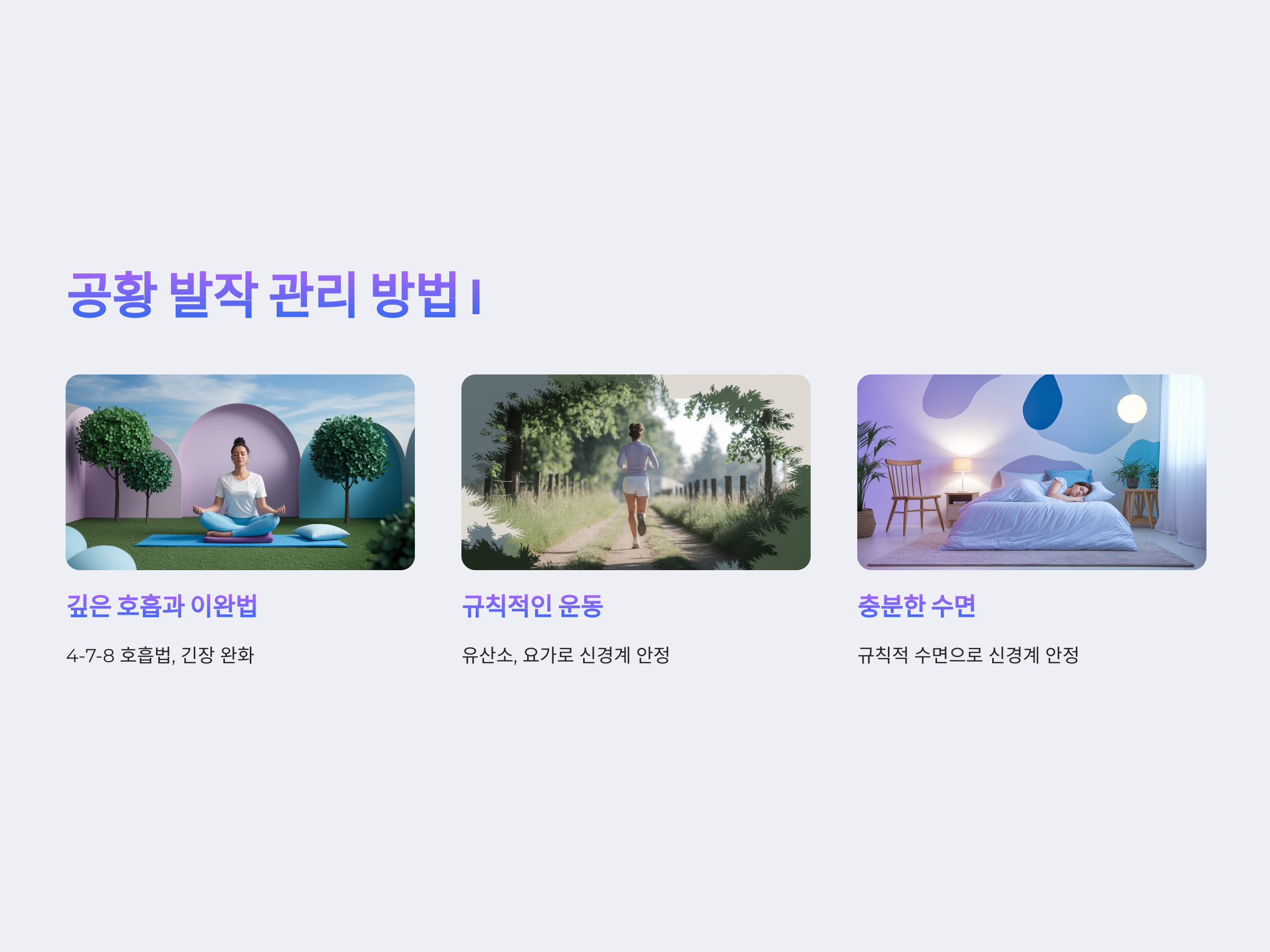 규칙적인 운동은 신체의 전반적인 건강을 증진시키며, 스트레스를 해소하는 데 도움이 됩니다. 특히 유산소 운동이나 요가, 명상은 신경계를 안정시키고, 공황 발작의 빈도를 줄이는 데 효과적입니다.