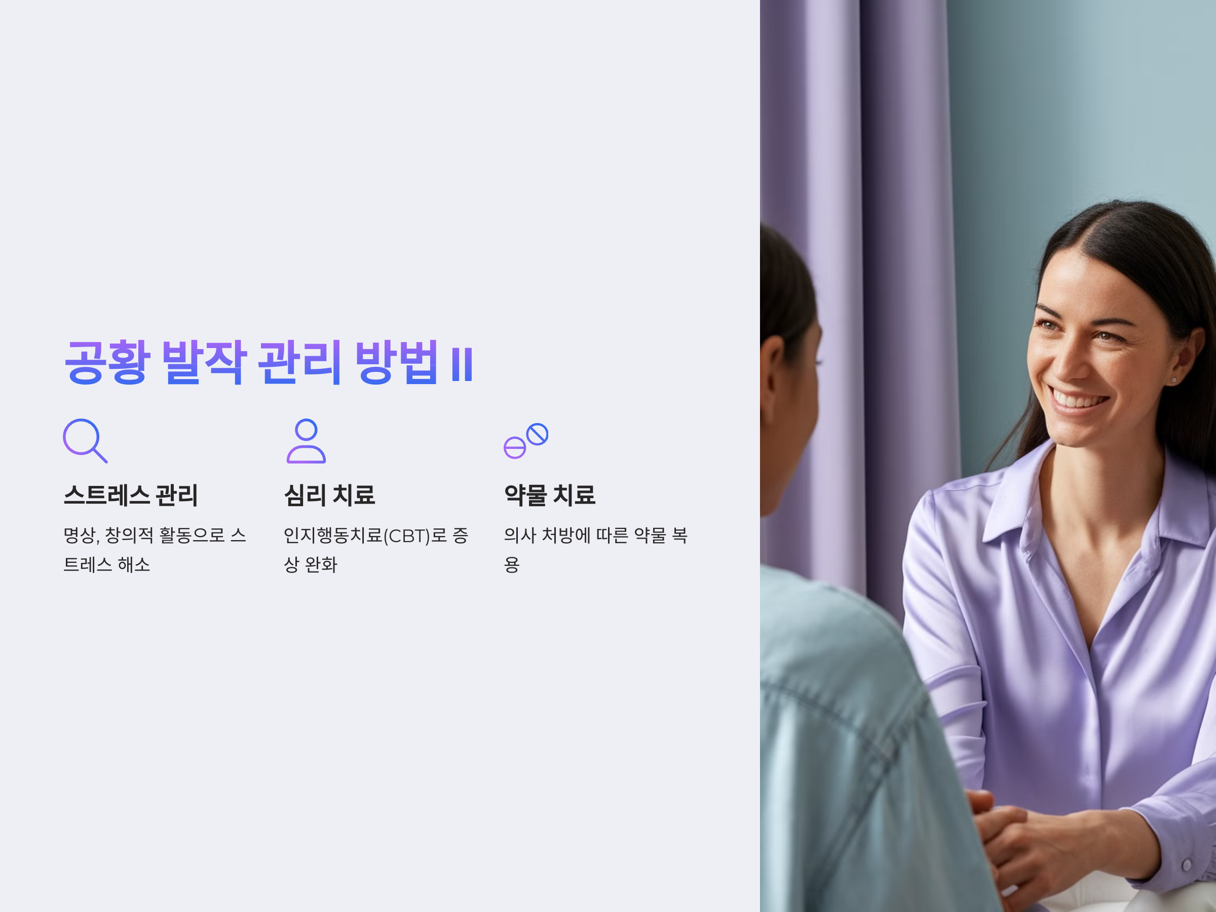 심리 치료나 약물 치료는 공황 발작을 관리하는 데 중요한 역할을 할 수 있습니다. 인지행동치료(CBT)는 공황 발작의 증상을 완화하는 데 효과적이며, 약물 치료도 의사의 처방에 따라 사용할 수 있습니다.