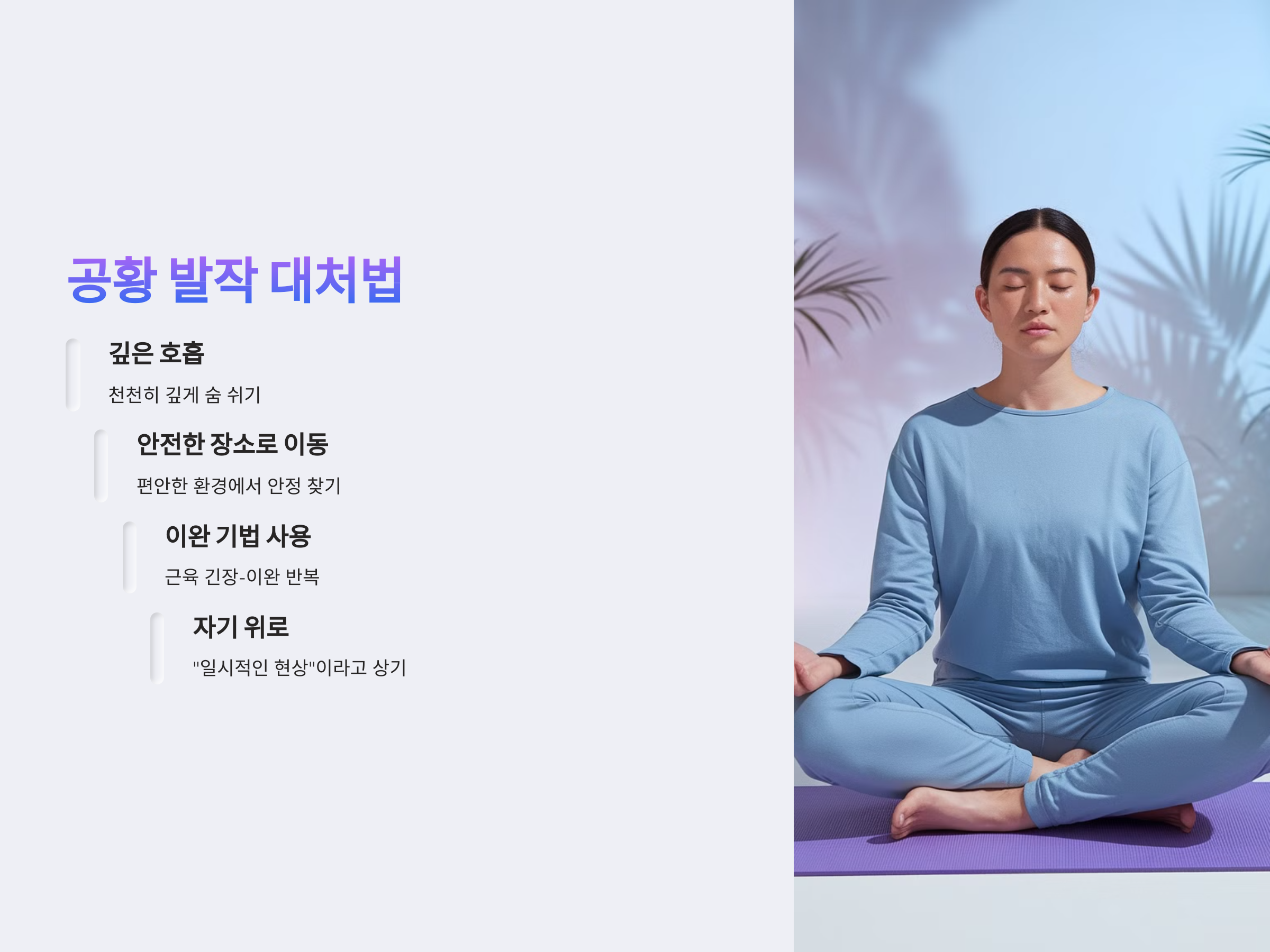 공황 발작을 경험하면, 먼저 깊은 호흡을 시도해보세요. 천천히 깊게 숨을 들이마시고, 다시 천천히 내쉬며 심박수를 안정시킵니다.
