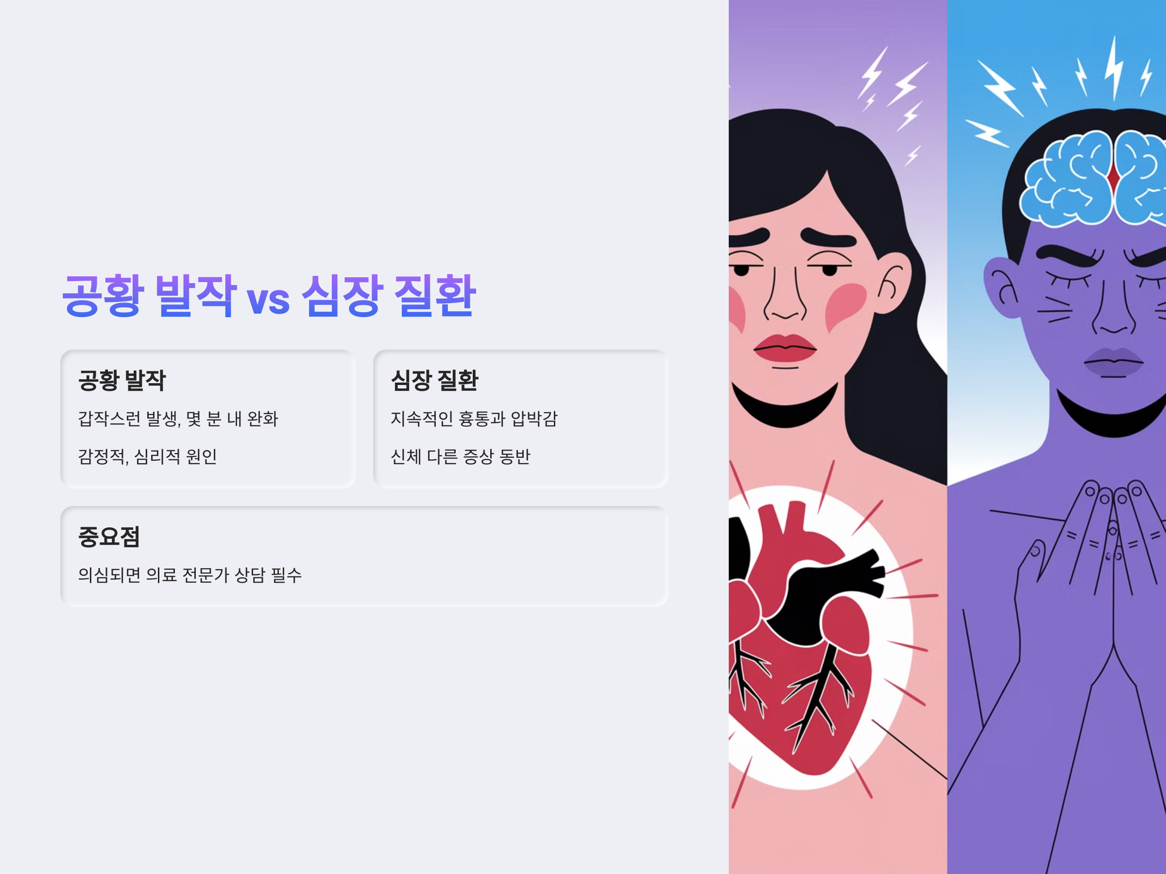 공황 발작의 가슴 압박감과 숨 가쁨은 심각한 증상일 수 있지만, 심장 질환과는 다릅니다. 이 두 증상은 종종 비슷하게 느껴질 수 있지만, 그 본질적인 원인은 다릅니다. 심장 질환에서는 흉통이나 가슴의 압박이 지속적이고, 신체의 다른 증상들이 동반될 수 있습니다. 반면, 공황 발작은 갑작스럽게 발생하며, 몇 분 내로 증상이 완화됩니다. 중요한 점은 공황 발작이 신체적인 질환에서 오는 것이 아니라, 감정적, 심리적 원인으로 발생한다는 것입니다.