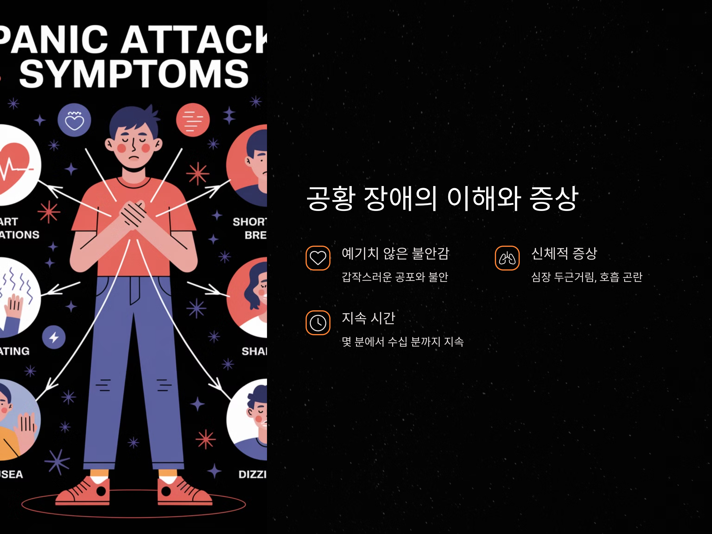 공황 장애는 예기치 않은 상황에서 갑작스럽게 불안감을 느끼고, 심장이 빠르게 뛰거나 숨이 가빠지는 등의 신체적 증상을 동반하는 상태입니다. 이러한 증상은 몇 분에서 수십 분까지 지속될 수 있으며, 심각한 경우 일상 생활에 지장을 줄 수 있습니다. 공황 장애는 종종 예기치 못한 상황에서 발생하기 때문에, 진단이 어려울 수 있으며 치료가 필요한 경우가 많습니다.