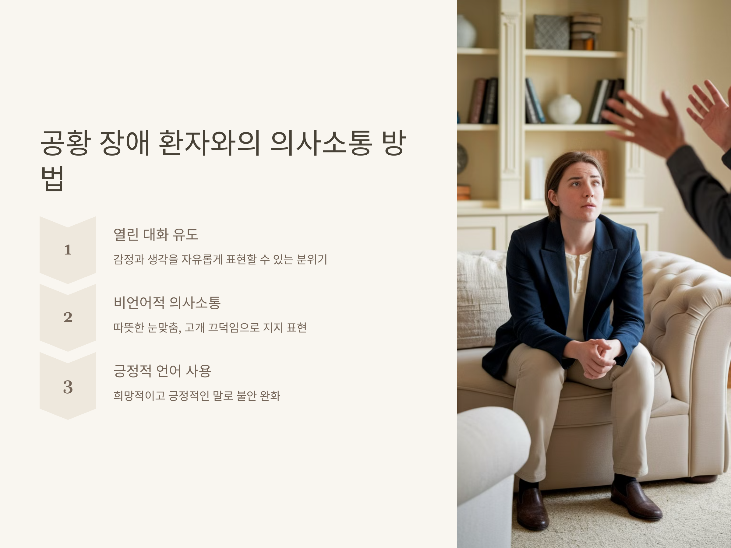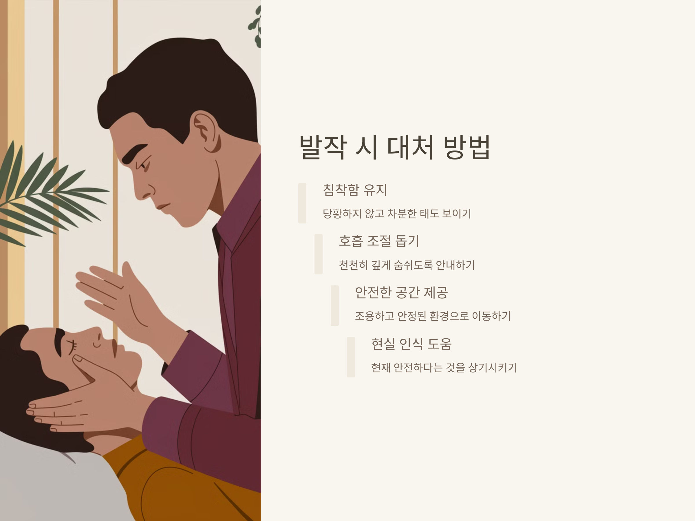 - 발작 시 대처 방법 숙지하기: 공황 발작이 발생했을 때 당황하지 않고 환자를 안정시키는 방법을 알아두세요. 차분한 목소리로 호흡을 조절하도록 도와주고, 안전한 공간을 제공하는 것이 중요합니다.