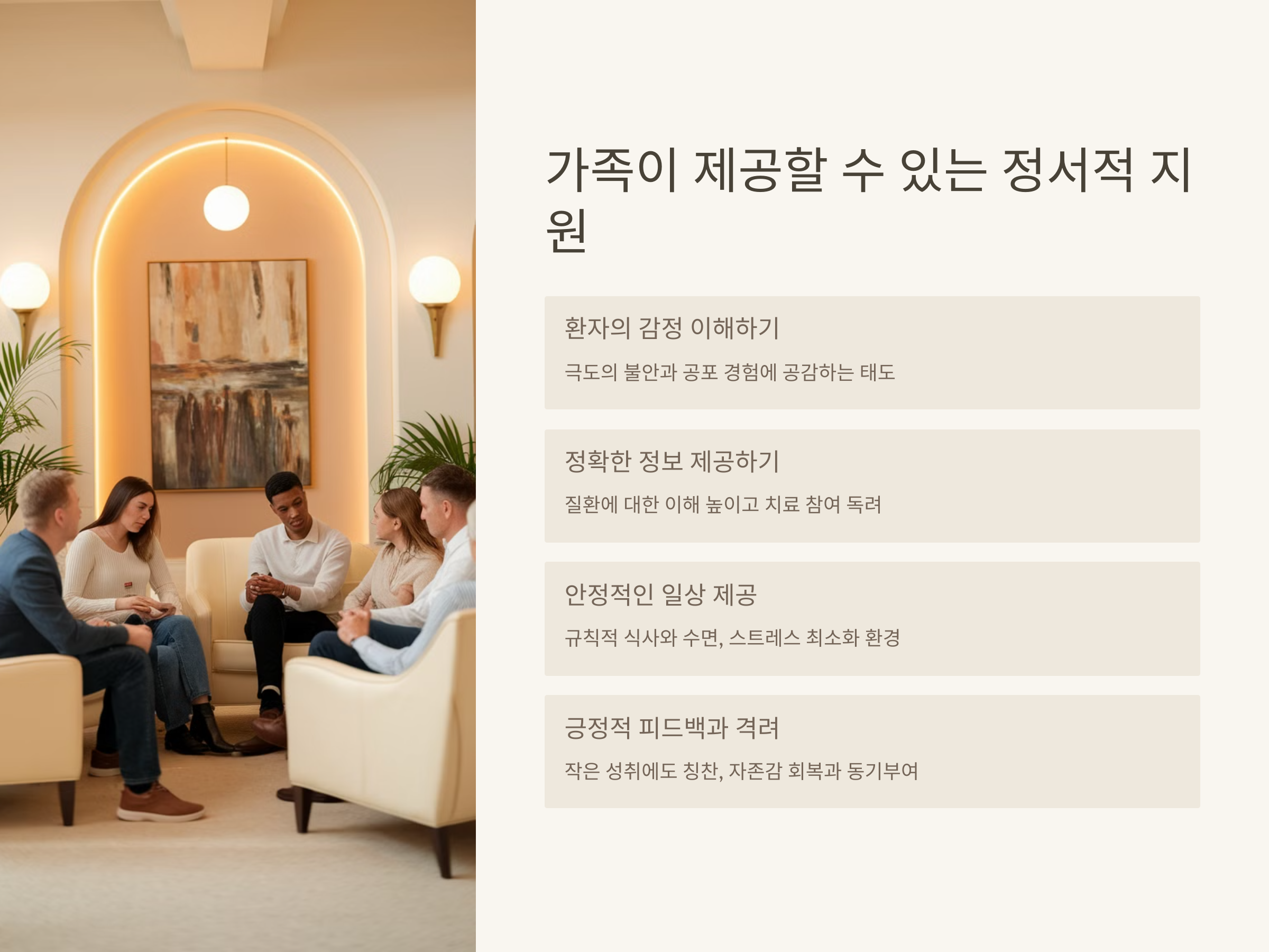 - 전문가와의 협력하기: 치료 과정에 가족이 함께 참여하여 환자가 혼자가 아니라는 느낌을 받을 수 있도록 합니다. 정기적인 상담에 동행하거나 치료 계획을 함께 논의하는 것도 좋은 방법입니다.