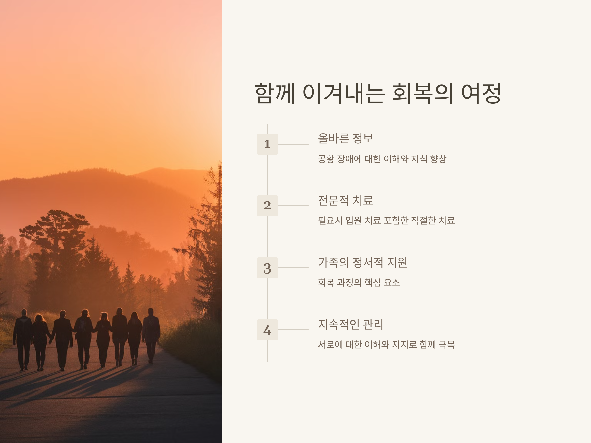공황 장애는 환자와 가족 모두에게 도전적인 질환이지만, 올바른 정보와 지원을 통해 극복할 수 있습니다. 입원 치료는 특정한 상황에서 고려되며, 가족의 정서적 지원은 환자의 회복에 큰 힘이 됩니다. 서로에 대한 이해와 지지를 바탕으로 함께 이겨내시길 바랍니다.