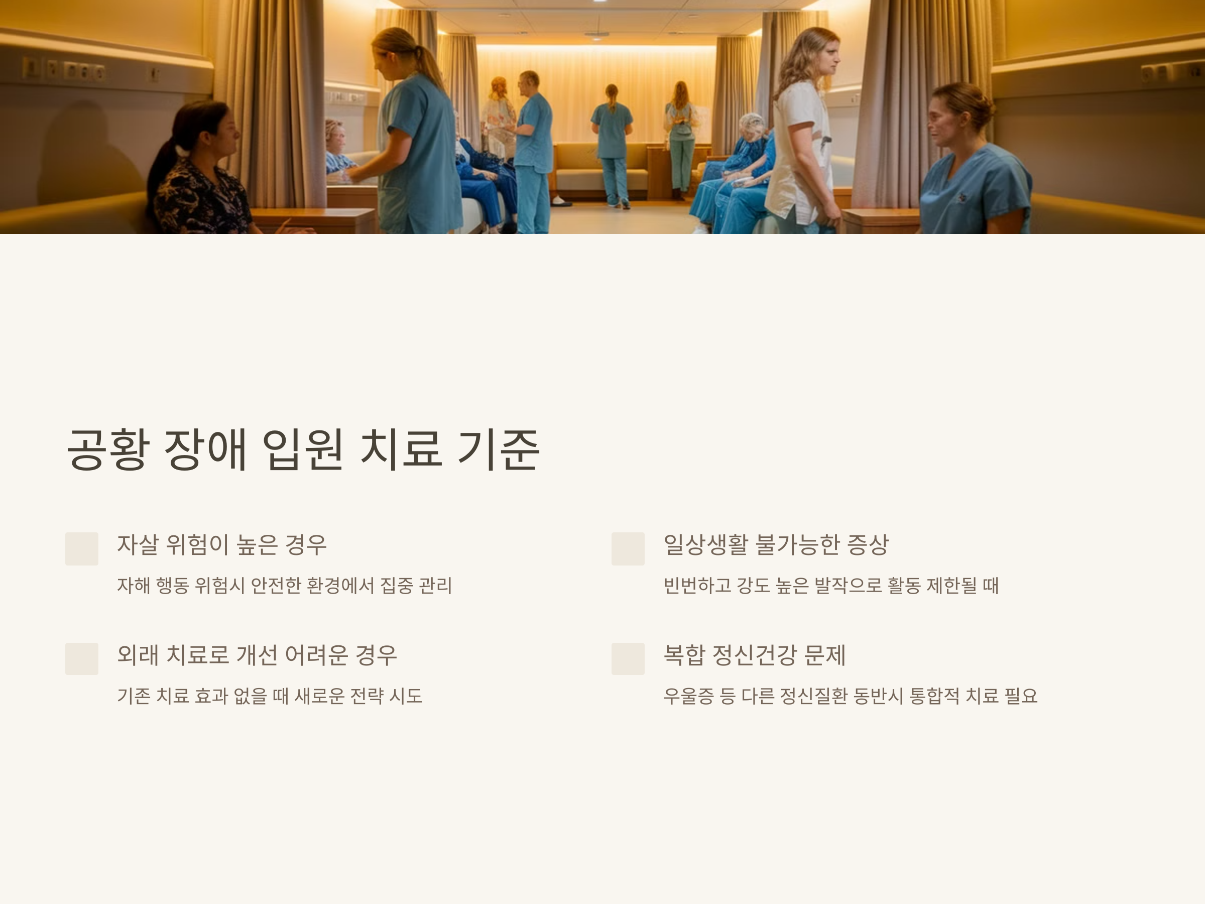 공황 장애 환자에게 입원 치료는 다음과 같은 상황에서 고려됩니다:
