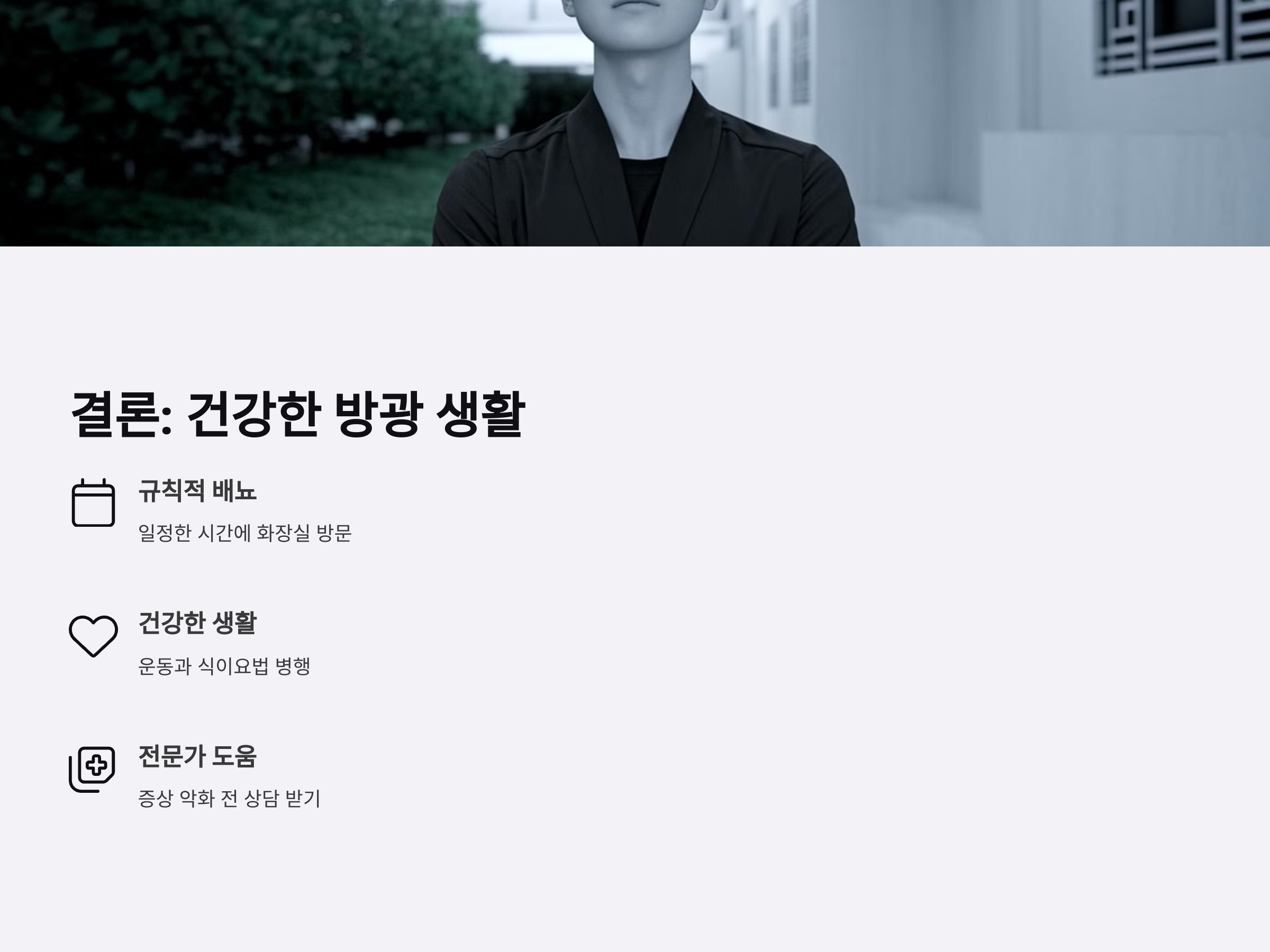 배뇨 훈련은 과민성 방광을 개선하는 데 중요한 방법 중 하나입니다. 일정 시간 간격으로 배뇨를 시도하여 방광을 훈련시킬 수 있습니다. 처음에는 1시간 간격으로 배뇨를 시도하고, 점차 간격을 늘려 나갑니다. 이렇게 하면 방광의 용량을 늘리고, 요절박감을 줄일 수 있습니다.