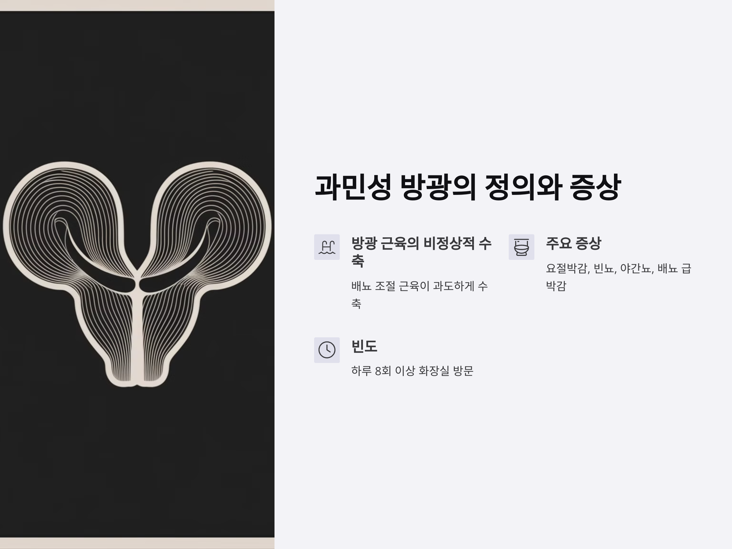 과민성 방광은 배뇨를 조절하는 근육인 방광이 비정상적으로 과도하게 수축하여 발생하는 상태입니다. 이로 인해 배뇨를 자주 하고, 요절박감을 느끼게 됩니다. 요절박감은 즉각적으로 화장실에 가고 싶은 강한 충동을 느끼는 것으로, 종종 배뇨를 참기 어려운 상태를 초래합니다. 과민성 방광의 주요 증상은 다음과 같습니다: