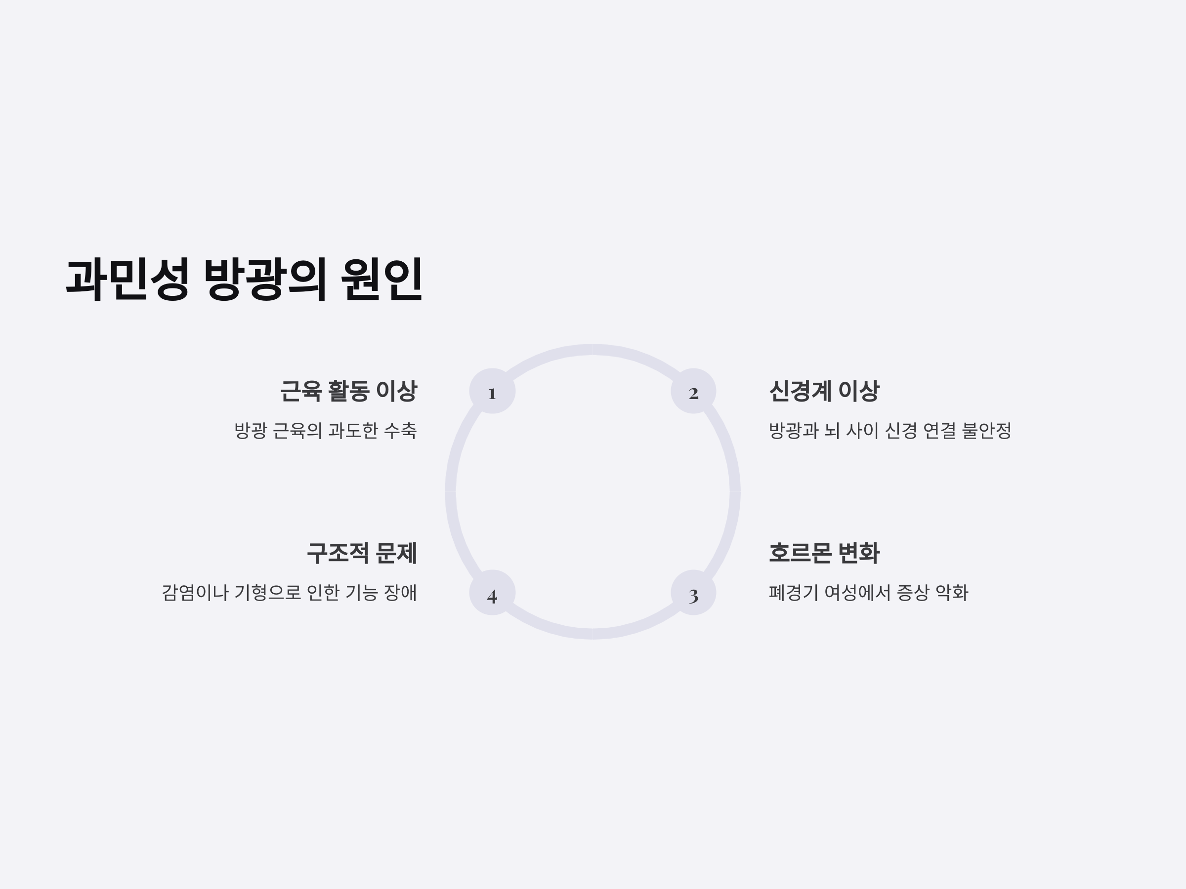 - 신경계 이상: 방광과 뇌 사이의 신경 연결이 불안정할 때 과민성 방광이 발생할 수 있습니다.