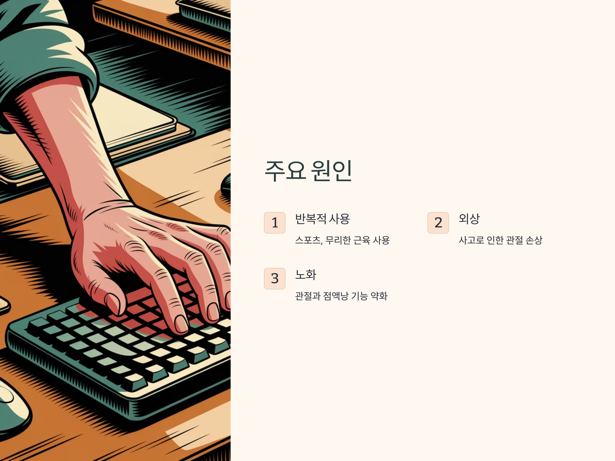 또한 외상이나 사고로 인한 관절 부위의 손상도 점액낭염을 일으킬 수 있습니다. 특히 관절에 충격을 받았을 때 점액낭이 손상되어 염증이 발생하는 경우가 많습니다. 나이가 들면서 관절과 점액낭의 기능이 약해지기도 하여, 이런 원인에 의해 점액낭염이 발생할 위험이 높아집니다.