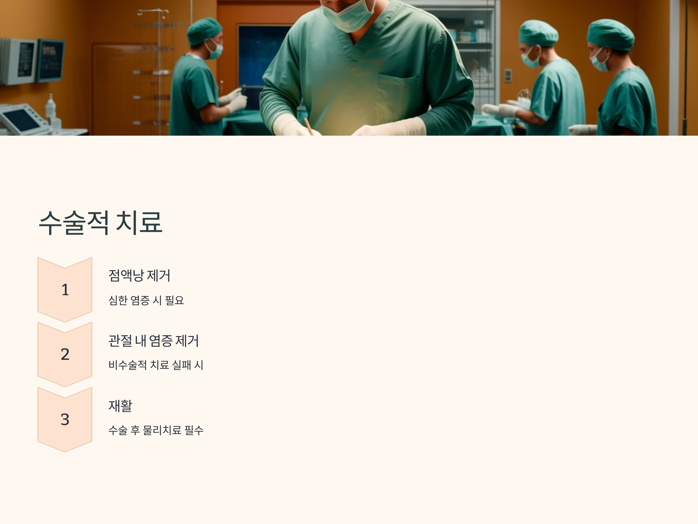 만약 비수술적인 치료로 효과가 없거나 염증이 심한 경우에는 수술이 필요할 수 있습니다. 수술 방법으로는 점액낭을 제거하거나 관절 내 염증을 제거하는 수술이 있습니다. 수술 후에는 재활과 물리치료가 필요하며, 빠른 회복을 위해 꾸준한 관리가 필요합니다.