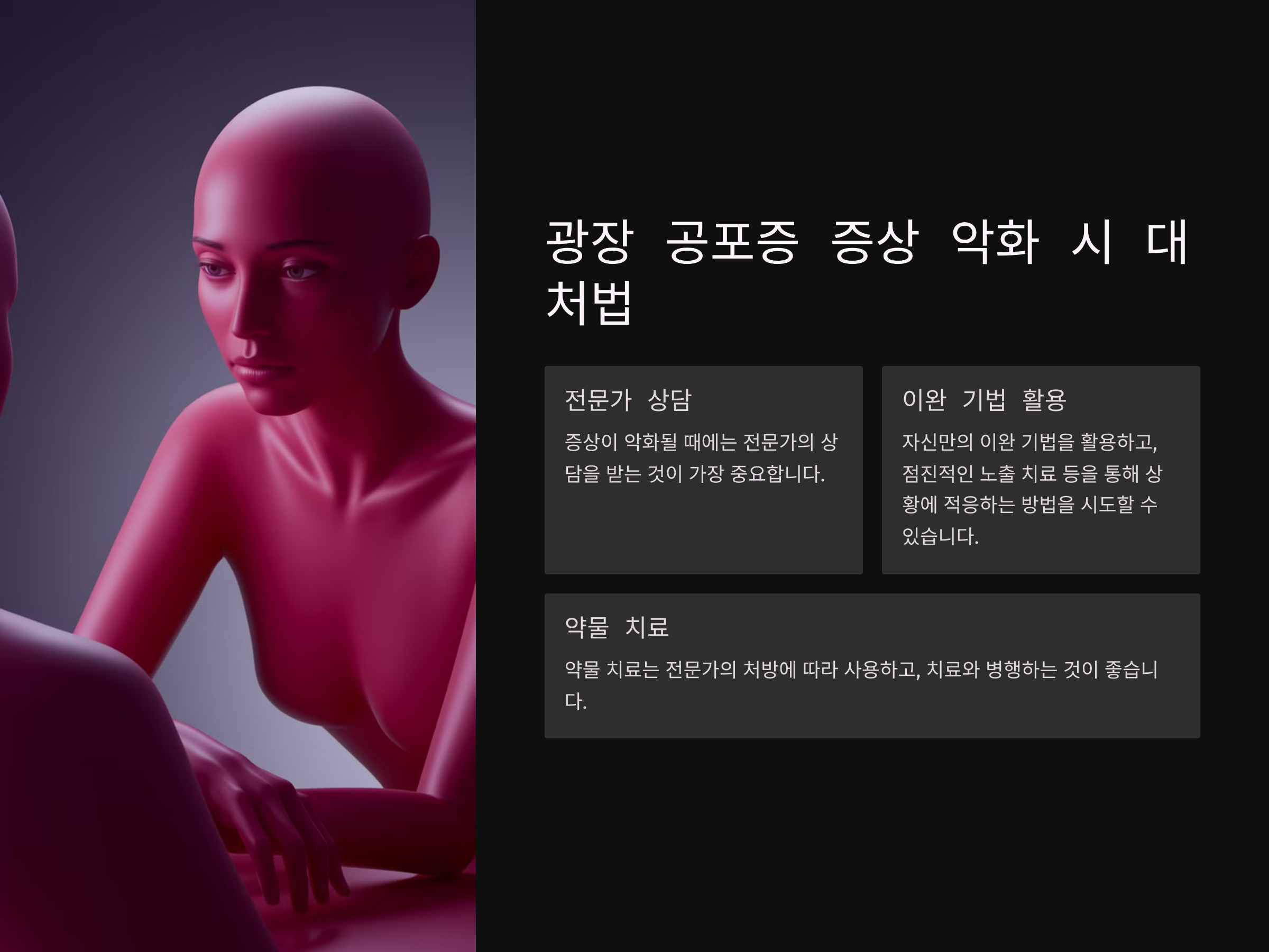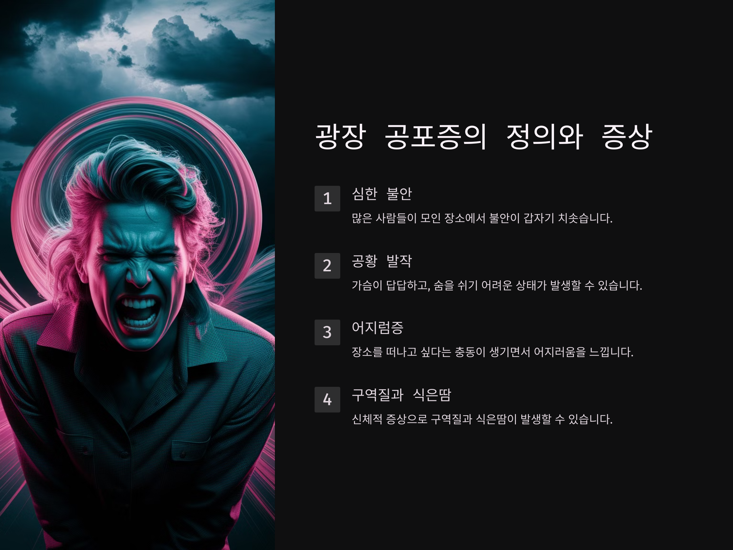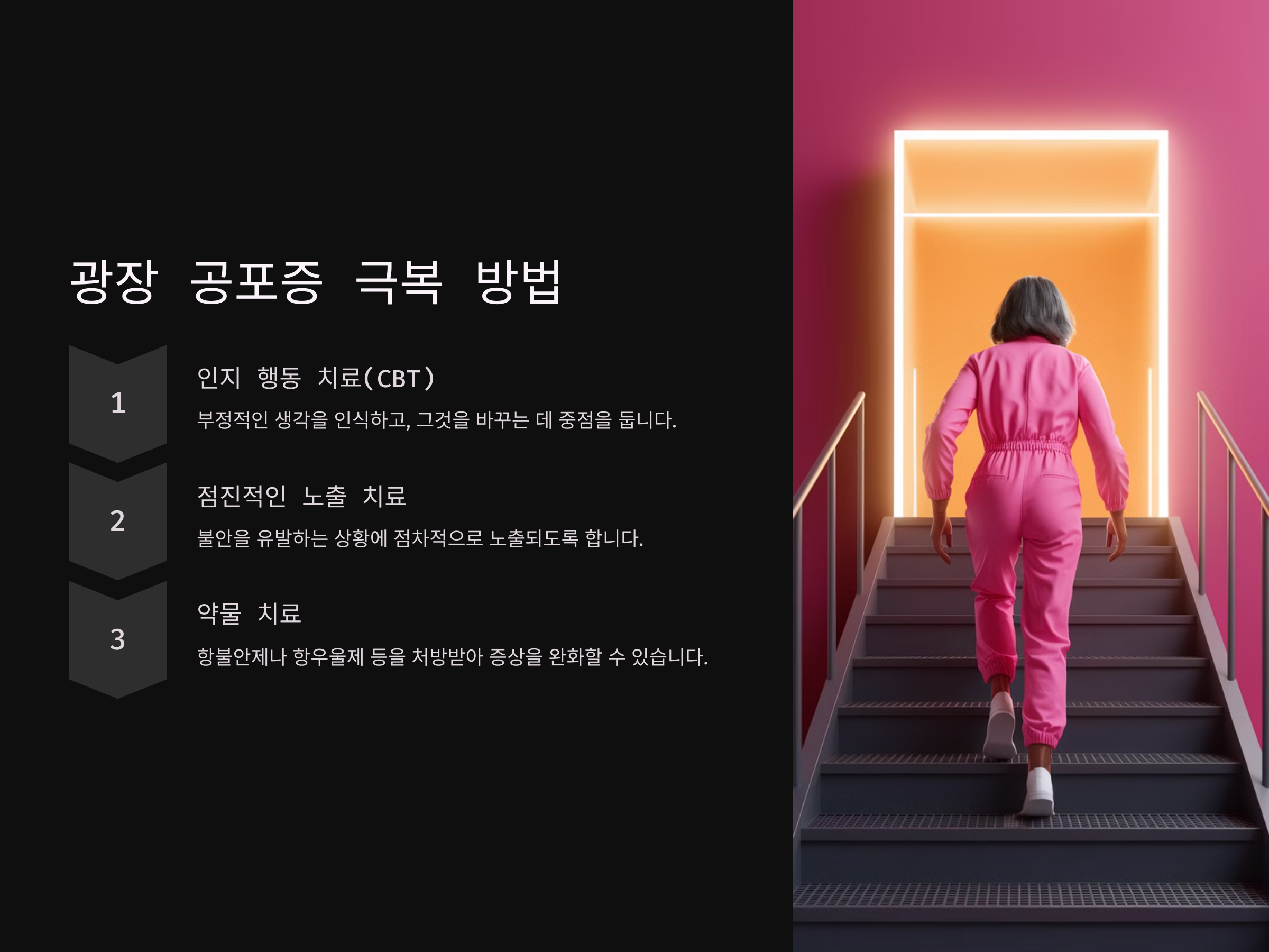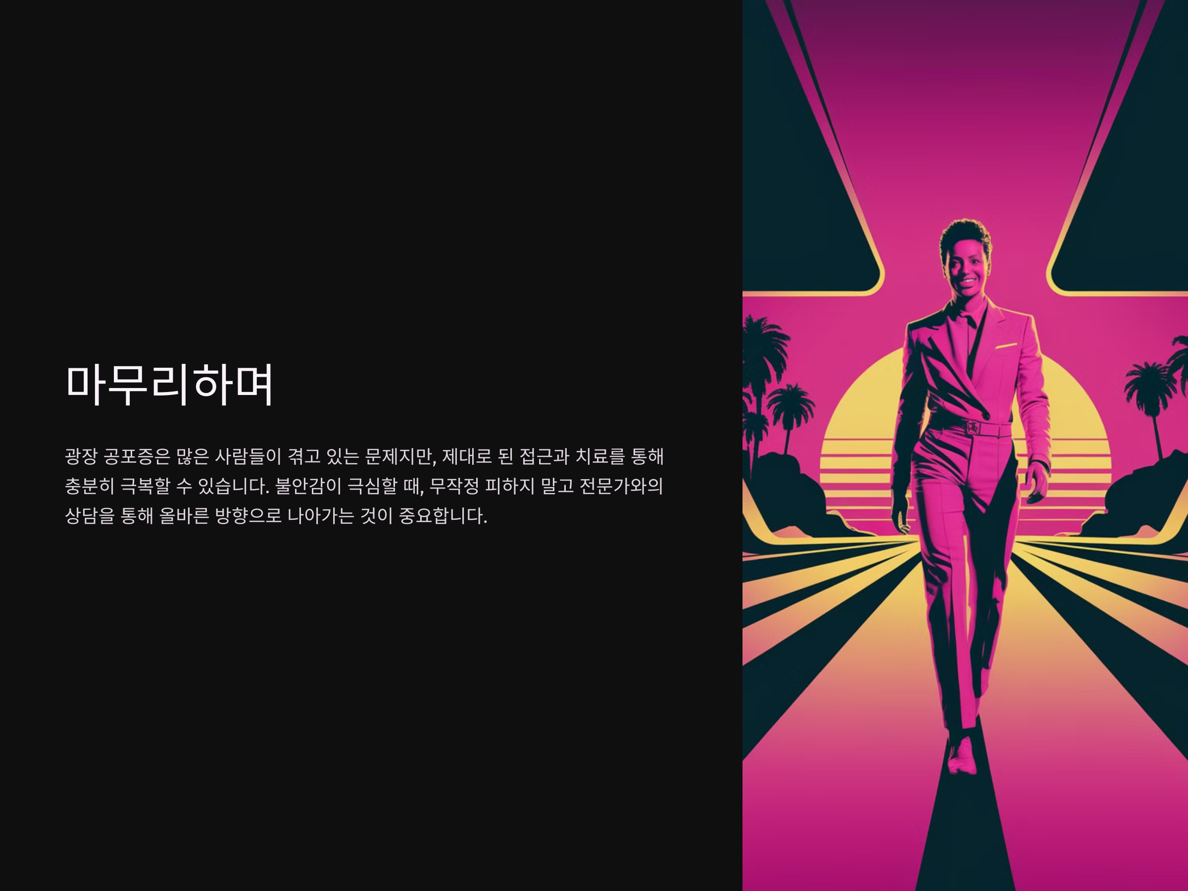 광장 공포증은 일상생활에 큰 영향을 미치는 정신적 장애일 수 있습니다. 그러나 이 문제는 충분히 극복할 수 있는 장애이며, 전문가와의 치료를 통해 점차적으로 개선할 수 있습니다. 중요한 것은 자신을 이해하고, 적절한 치료 방법을 찾는 것입니다. 만약 이 글을 읽고 자신이나 주변인이 겪고 있는 불안에 대해 더 알고 싶다면, 전문가의 도움을 받는 것을 추천합니다.