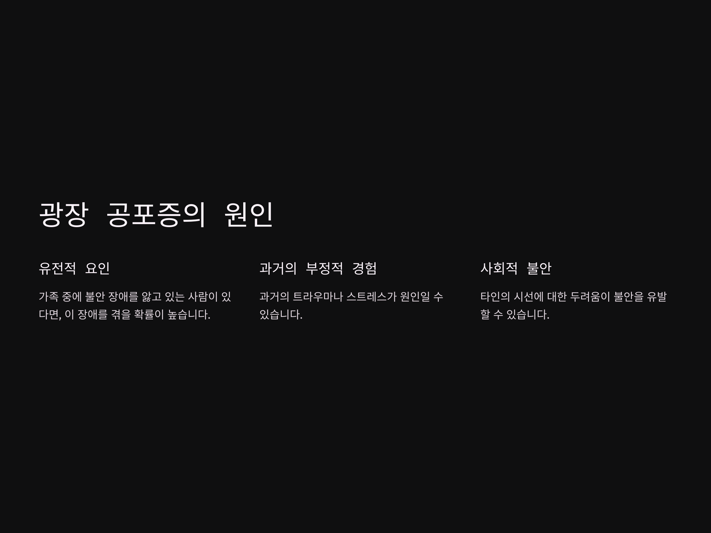 광장 공포증은 종종 과거의 트라우마나 스트레스가 원인일 수 있습니다. 예를 들어, 사람 많은 곳에서 공황 발작을 경험한 후, 다시 그 장소에 가면 불안감이 커질 수 있습니다.