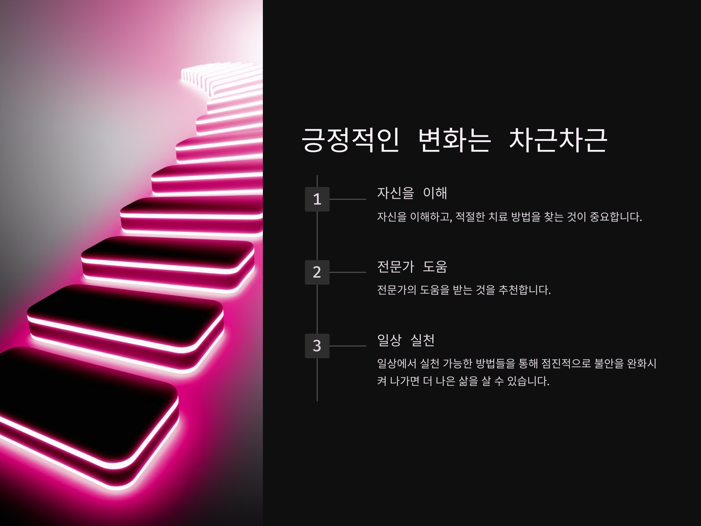 광장 공포증은 많은 사람들이 겪고 있는 문제지만, 제대로 된 접근과 치료를 통해 충분히 극복할 수 있습니다. 불안감이 극심할 때, 무작정 피하지 말고 전문가와의 상담을 통해 올바른 방향으로 나아가는 것이 중요합니다. 긍정적인 변화는 차근차근 이루어질 수 있습니다. 또한, 일상에서 실천 가능한 방법들을 통해 점진적으로 불안을 완화시켜 나가면 더 나은 삶을 살 수 있습니다.