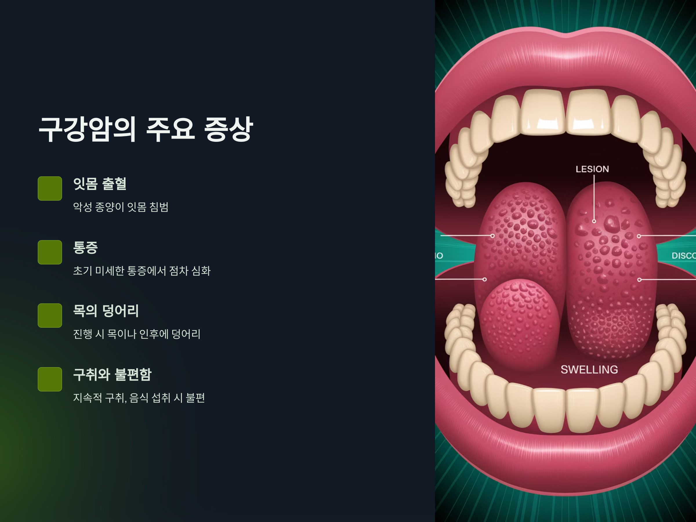 구강암의 주요 증상은 다양하지만, 가장 중요한 신호 중 하나는 바로 잇몸 출혈입니다. 구강암이 발전하면서 나타나는 증상은 다음과 같습니다: