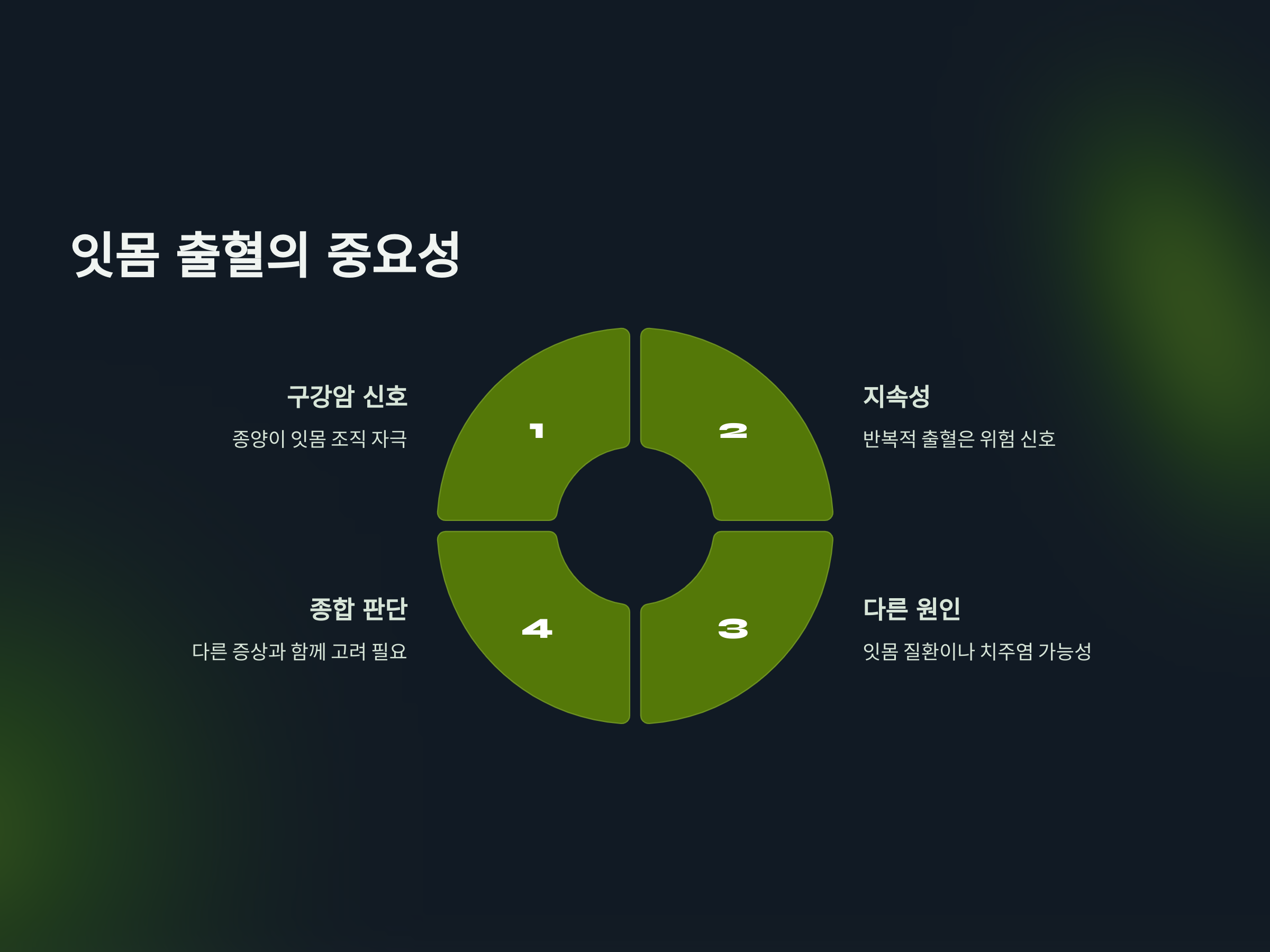 구강암은 종종 구강 내에 악성 종양이 생기는 질병으로, 처음에는 가벼운 증상으로 나타날 수 있습니다. 그 중 하나가 바로 잇몸 출혈입니다. 잇몸에서 출혈이 발생하는 이유는 종양이 잇몸 조직을 자극하거나 침투하면서 발생할 수 있기 때문입니다. 그러나 잇몸 출혈이 항상 구강암을 의미하는 것은 아니며, 잇몸 질환이나 치주염과 같은 다른 원인도 있을 수 있습니다. 그렇지만 잇몸 출혈이 지속되거나 다른 구강암 증상(예: 구취, 통증, 목에 덩어리 등)과 함께 나타날 경우, 구강암을 의심하고 병원에 방문하는 것이 매우 중요합니다.