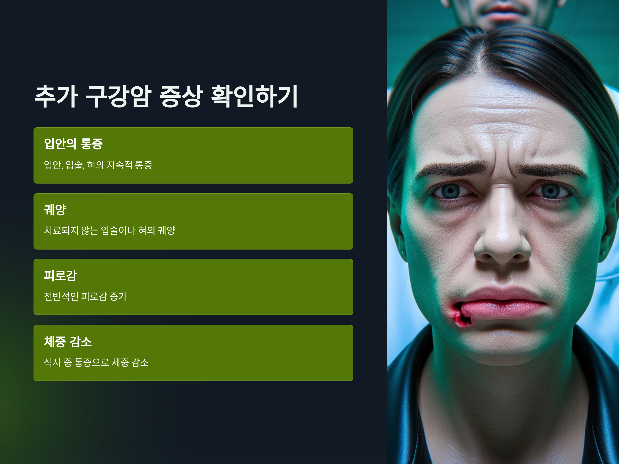 구강암이 의심될 경우, 잇몸 출혈 외에도 다음과 같은 증상을 확인해 보세요: