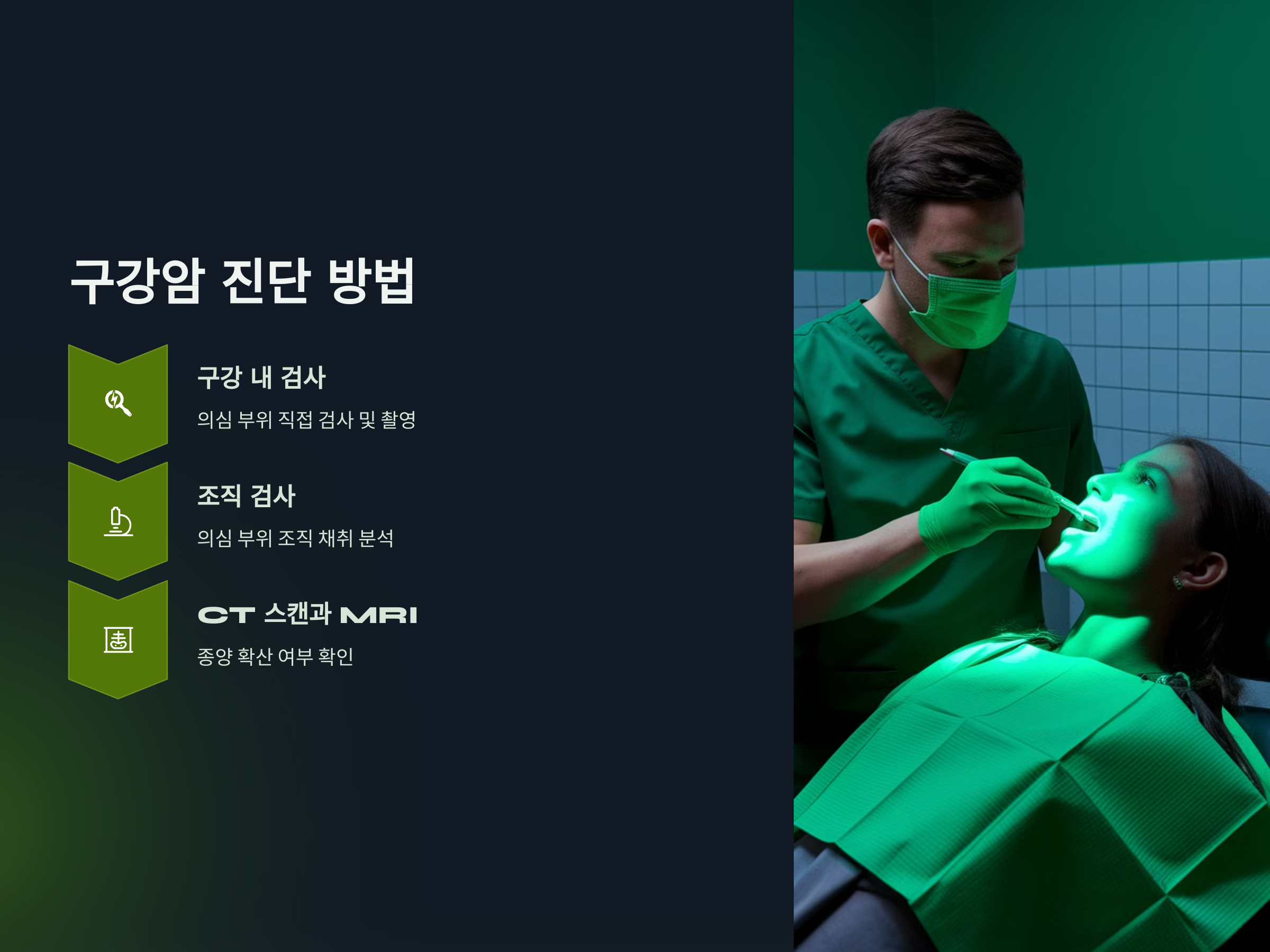 - 조직 검사: 구강 내에서 의심되는 부위의 조직을 채취하여 암세포 여부를 확인합니다.