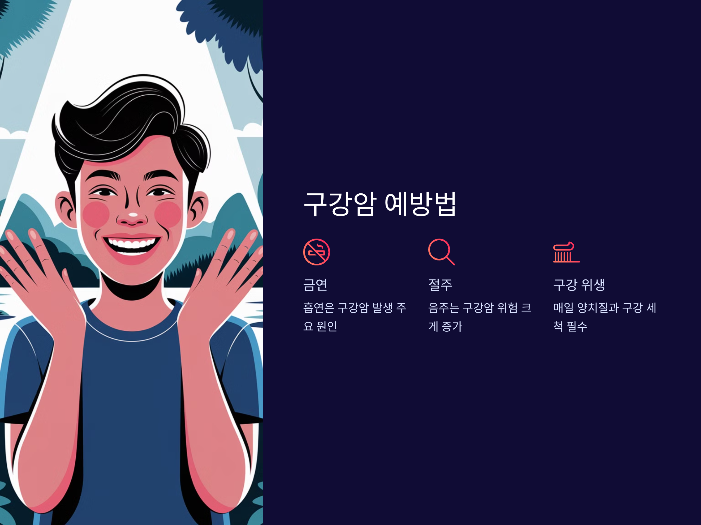 구강암의 예방은 생활습관과 관련이 깊습니다. 가장 중요한 예방책은 흡연과 음주를 피하는 것입니다. 흡연과 음주는 구강암 발생의 주요 원인으로 알려져 있으며, 이러한 습관이 있으면 구강암의 위험이 크게 증가합니다. 또한, 규칙적인 구강 위생 관리가 중요합니다. 매일 양치질과 구강 세척을 통해 입안을 깨끗하게 유지하고, 정기적으로 치과에 방문하여 구강 건강 상태를 점검받는 것이 구강암 예방에 도움이 됩니다.