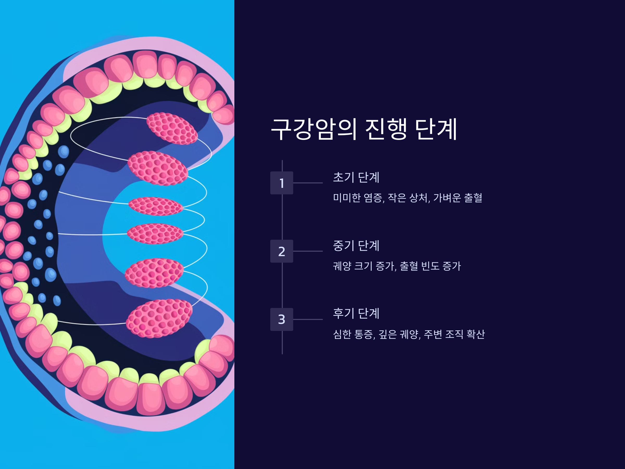 후기 단계에서는 통증이 매우 심해지고, 입안의 궤양이 깊어지며 주변 조직으로 확산될 수 있습니다. 또한, 입에서 악취가 나거나 음식을 삼키기 어려운 증상이 나타날 수 있습니다. 이런 증상들이 지속되면 구강암이 이미 상당히 진행된 상태일 수 있습니다. 따라서 초기 단계에서 조기 발견이 중요한 이유는 이러한 증상들이 발전하기 전에 치료를 시작할 수 있기 때문입니다.