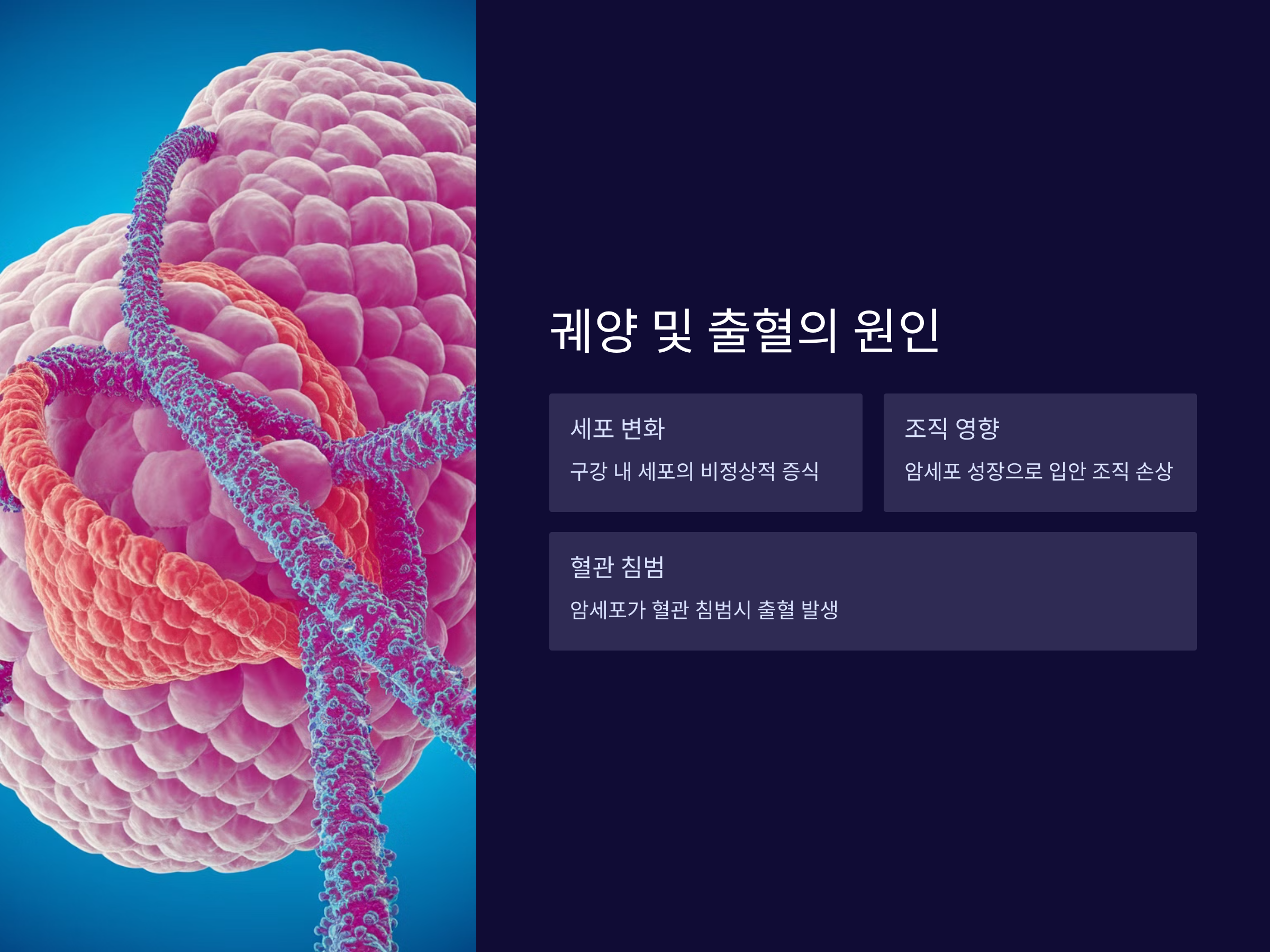 입안에 궤양이나 출혈이 생기는 주된 원인은 구강 내 세포의 비정상적인 변화입니다. 구강암은 이 세포들이 제어되지 않고 비정상적으로 증식하면서 발생합니다. 이러한 변화가 초기에 미미할 수 있으나, 암세포가 성장하고 증식하면서 입안의 조직에 영향을 미칩니다. 궤양은 구강암의 전형적인 증상 중 하나로, 지속적으로 치료되지 않으면 점점 더 커질 수 있습니다. 구강암이 진행될수록 궤양은 더욱 심해지고, 출혈이 동반되기 시작할 수 있습니다.