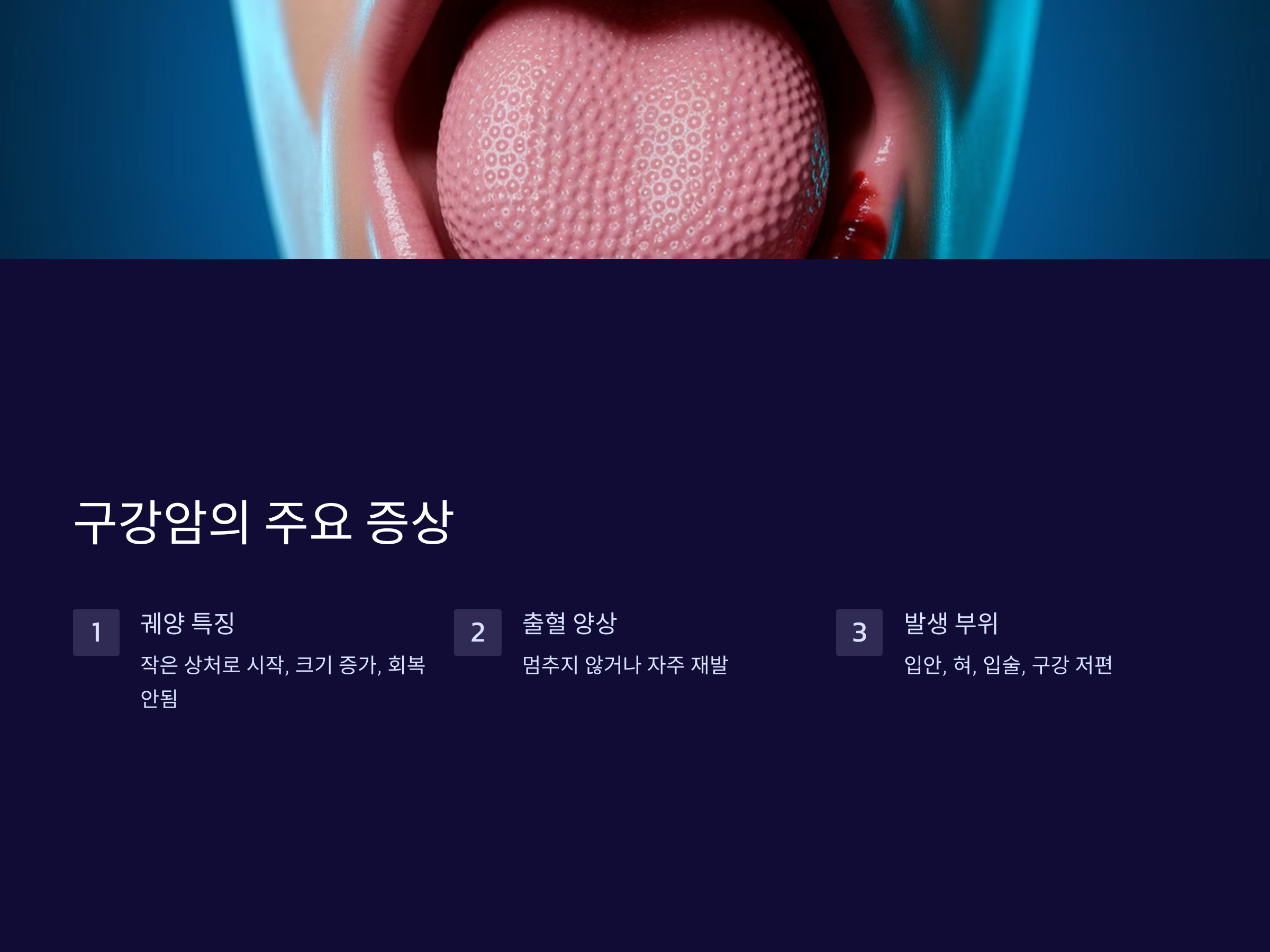 구강암은 초기 증상이 미미하여 쉽게 간과될 수 있지만, 입안에 궤양이나 출혈이 발생하면 이는 구강암의 신호일 수 있습니다. 이런 증상이 나타나면 즉시 병원을 방문하여 조기에 진단을 받고 치료를 받는 것이 중요합니다. 구강암은 예방이 가능한 질환이므로, 건강한 생활습관을 유지하고, 구강 위생을 철저히 관리하는 것이 필수적입니다. 무엇보다 궤양이나 출혈이 지속될 경우 이를 방치하지 말고 전문가의 상담을 받는 것이 가장 중요합니다.