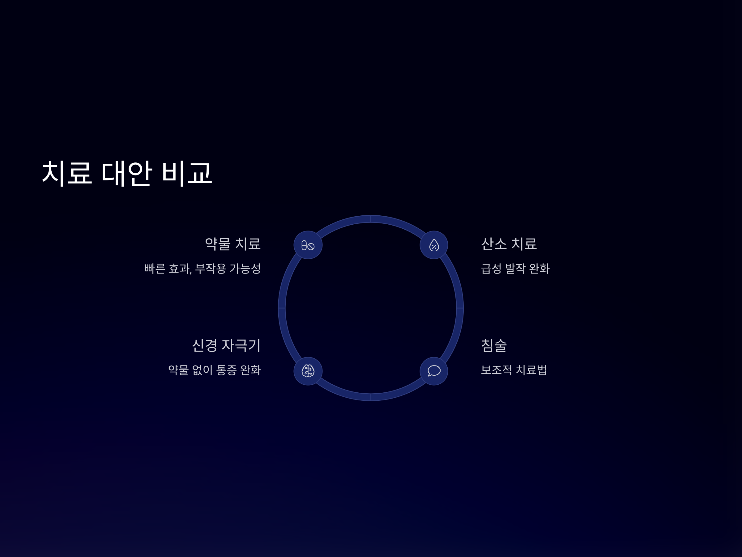 군발성 두통의 치료법으로는 약물 치료와 함께 산소 치료, 침술 등이 있습니다. 신경 자극기는 이러한 치료법에 비해 약물에 의한 부작용을 피할 수 있는 장점이 있습니다.