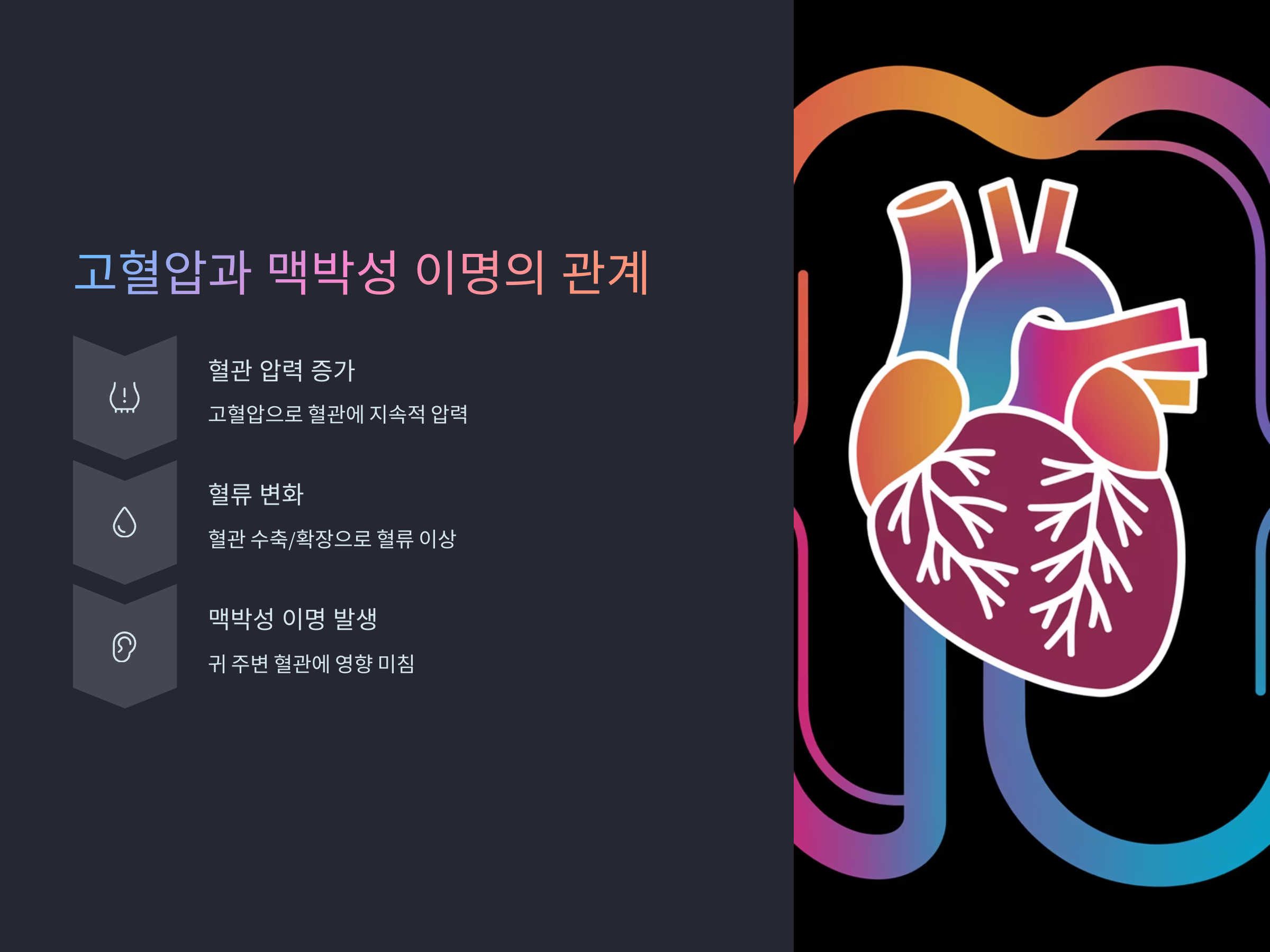 고혈압은 혈관에 영향을 미치는 질환으로, 장기간 방치될 경우 혈관이 약해지거나 두꺼워지는 등 변화가 일어납니다. 이는 귀의 혈류에 직접적인 영향을 미치며, 그 결과 맥박성 이명이 발생할 수 있습니다.