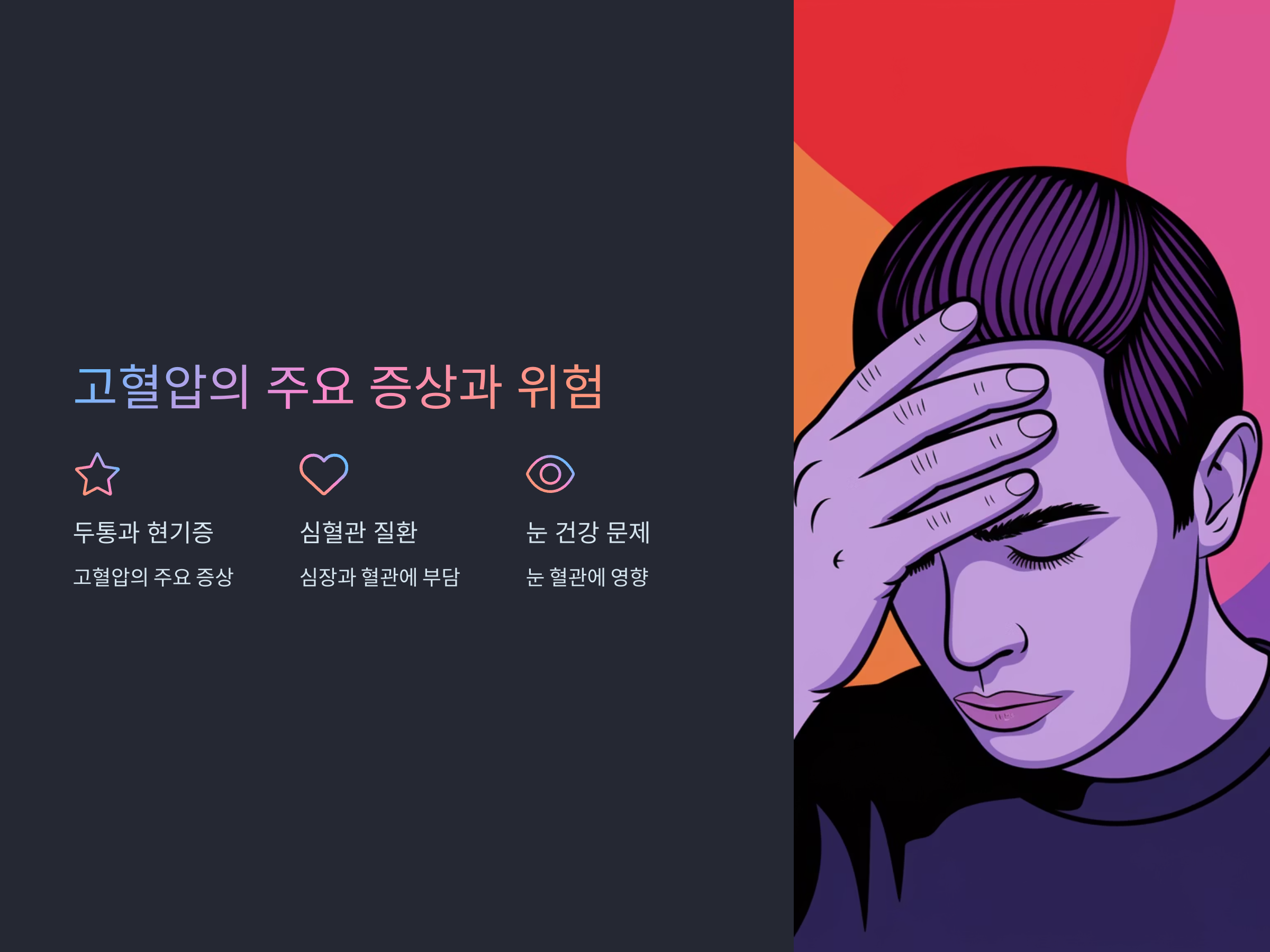 - 심혈관 질환: 고혈압이 지속되면 심장과 혈관에 부담을 주어 다양한 심혈관 질환이 발생할 수 있습니다.