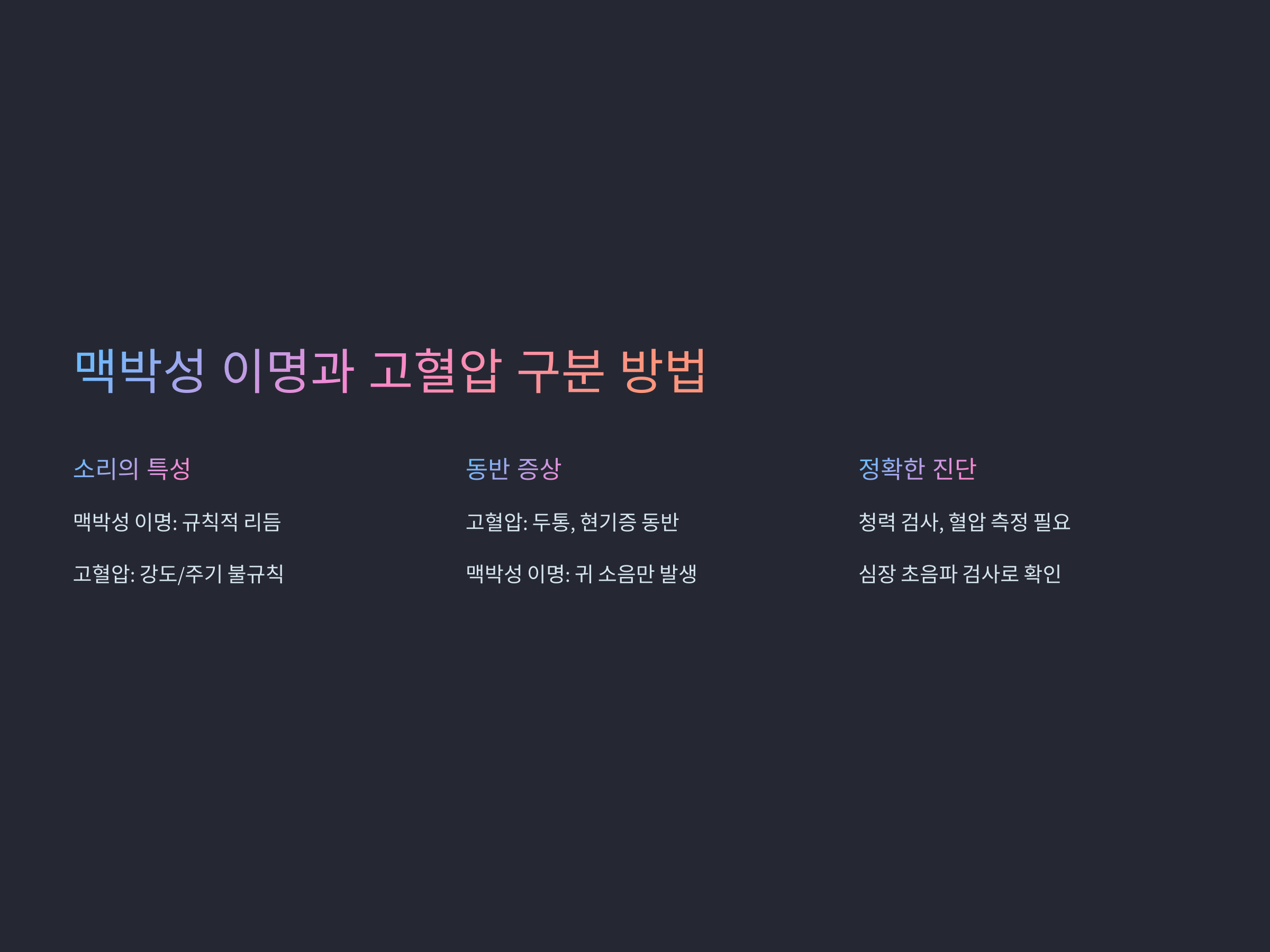 - 소리의 특성: 맥박성 이명은 심장 박동과 일치하는 규칙적인 리듬으로 들립니다. 고혈압에 의한 이명은 혈관에 의한 압력 변화로 발생하는데, 이 소리는 맥박성과 비슷하지만 그 강도나 주기가 불규칙할 수 있습니다.