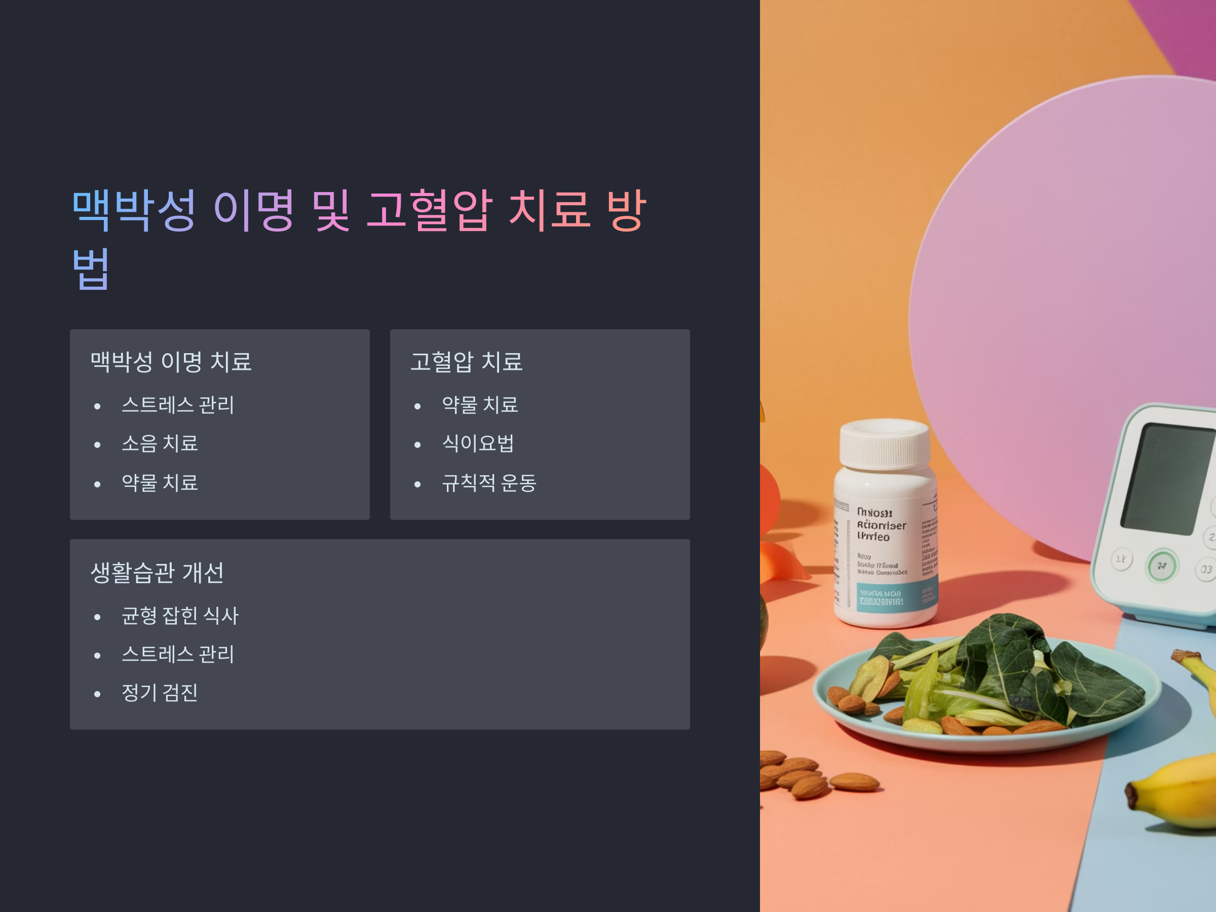 귀에서 들리는 맥박 소리나 고혈압이 확인된 경우, 적절한 치료가 필요합니다. 맥박성 이명은 일반적으로 의약적 치료보다는 생활습관의 변화와 더불어 보조적인 치료 방법이 필요합니다. 고혈압에 의한 맥박성 이명의 경우, 고혈압을 관리하는 것이 중요합니다.
