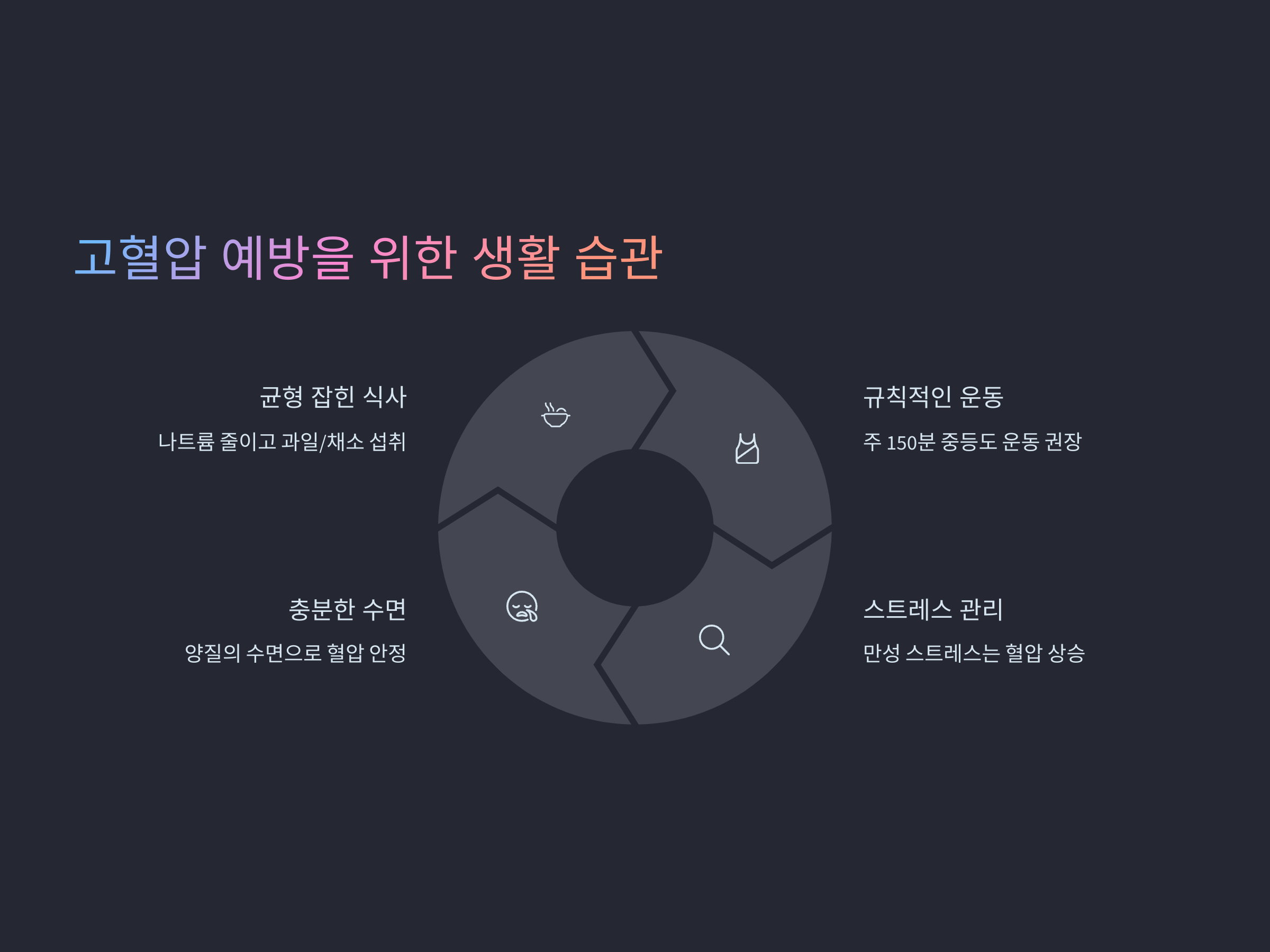 - 식이요법: 나트륨을 줄이고, 칼륨이 풍부한 음식을 섭취하는 것이 고혈압 관리에 도움이 됩니다.