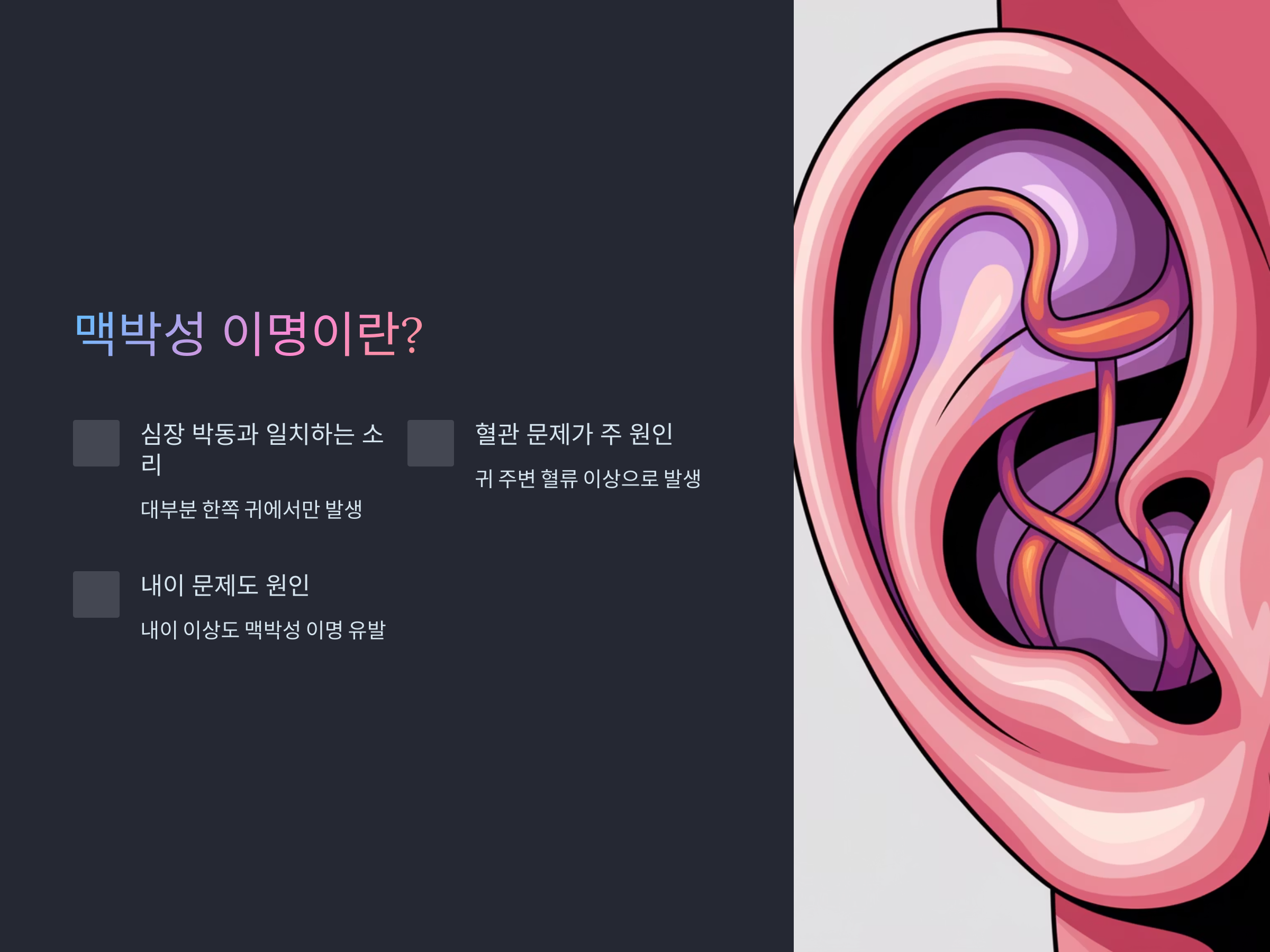 맥박성 이명은 귀에서 맥박에 맞춰 들리는 소리로, 심장 박동과 일치하는 소리가 귀 속에서 들리는 질환입니다. 이 소리는 대부분 한쪽 귀에서만 발생하며, 심장이 뛰는 것처럼 규칙적인 리듬을 느낄 수 있습니다. 맥박성 이명의 원인은 다양한데, 그 중 가장 흔한 원인으로는 혈관 문제나 귀 주변의 혈관이 영향을 미치는 경우가 많습니다. 이명은 귀 내부나 주변의 혈류 이상으로 인해 발생할 수 있습니다. 예를 들어, 귀에 가까운 혈관이 확장되거나 좁아지면, 혈류의 변화가 소리로 감지될 수 있습니다.