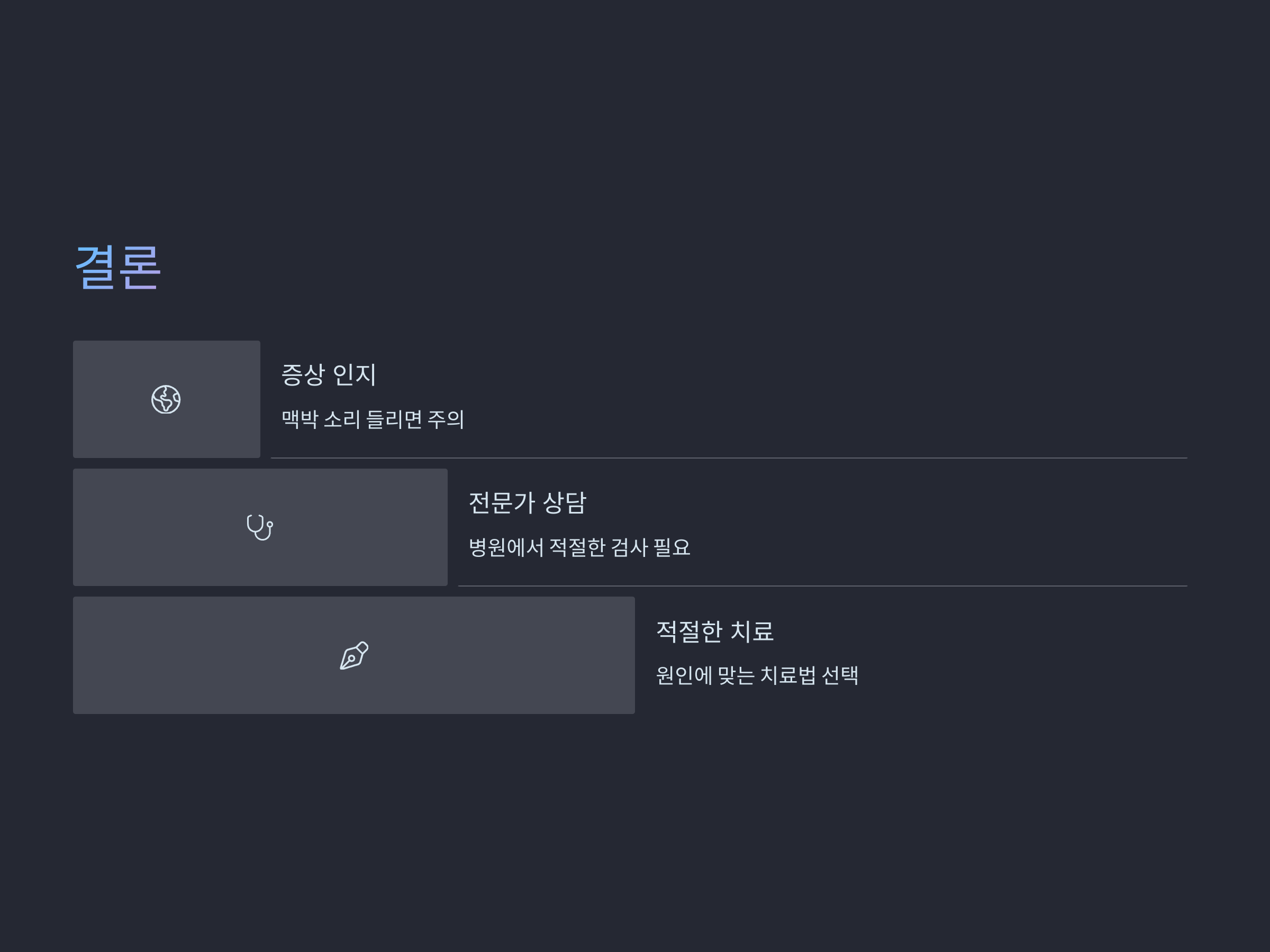 - 증상의 동반 여부: 고혈압이 원인인 경우 두통, 현기증, 피로 등의 증상이 함께 나타날 수 있습니다. 반면 맥박성 이명은 귀의 소음만을 유발하는 경우가 많습니다.