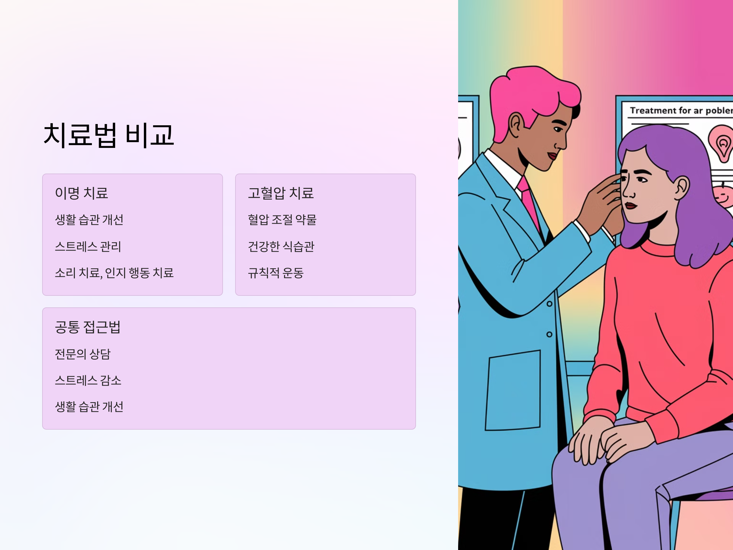 귀에서 '삐' 소리가 지속될 때, 정확한 원인을 파악하는 것이 중요합니다. 이명이란 귀에서 아무런 외부 자극 없이 특정한 소리가 들리는 증상으로, 대개 소음, 스트레스, 또는 건강 문제로 발생할 수 있습니다. 반면 고혈압성 혈관 문제는 혈압이 높아지면서 혈관이 압박을 받아 귀에 이상 소리를 유발할 수 있습니다. 두 가지의 차이를 구분하는 것이 중요하며, 이를 바탕으로 적절한 치료를 받을 수 있습니다.