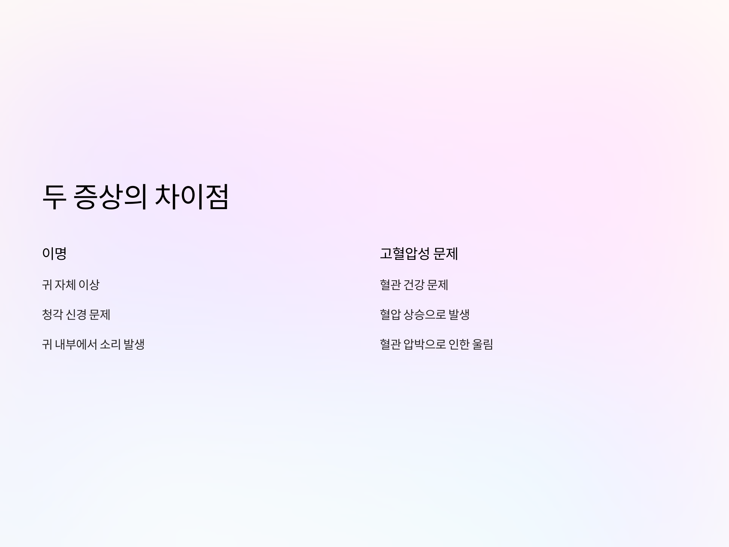 이명을 경험할 때, 일반적으로 귀 내부에서 발생하는 소리처럼 느껴지지만, 고혈압으로 인한 소리는 혈관의 압박과 혈류 변화로 발생하는 울림 소리로 구분됩니다. 또한 고혈압성 혈관 문제는 지속적인 고혈압이 원인이므로, 이명 외에도 두통, 어지러움, 호흡곤란 등 전신적인 증상들이 동반될 수 있습니다.