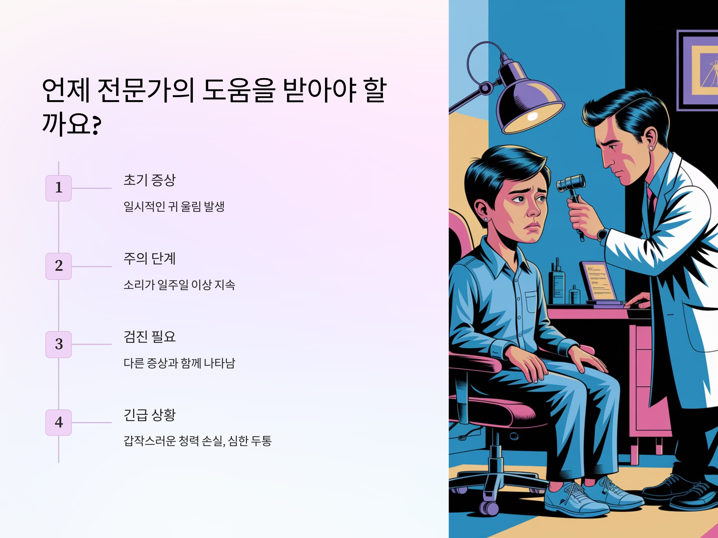 이명은 대개 통증을 동반하지 않지만, 지속적으로 소리가 나면 일상생활에 큰 영향을 미칠 수 있습니다. 따라서 이명이 지속된다면, 귀와 관련된 전문적인 진료를 받는 것이 중요합니다.