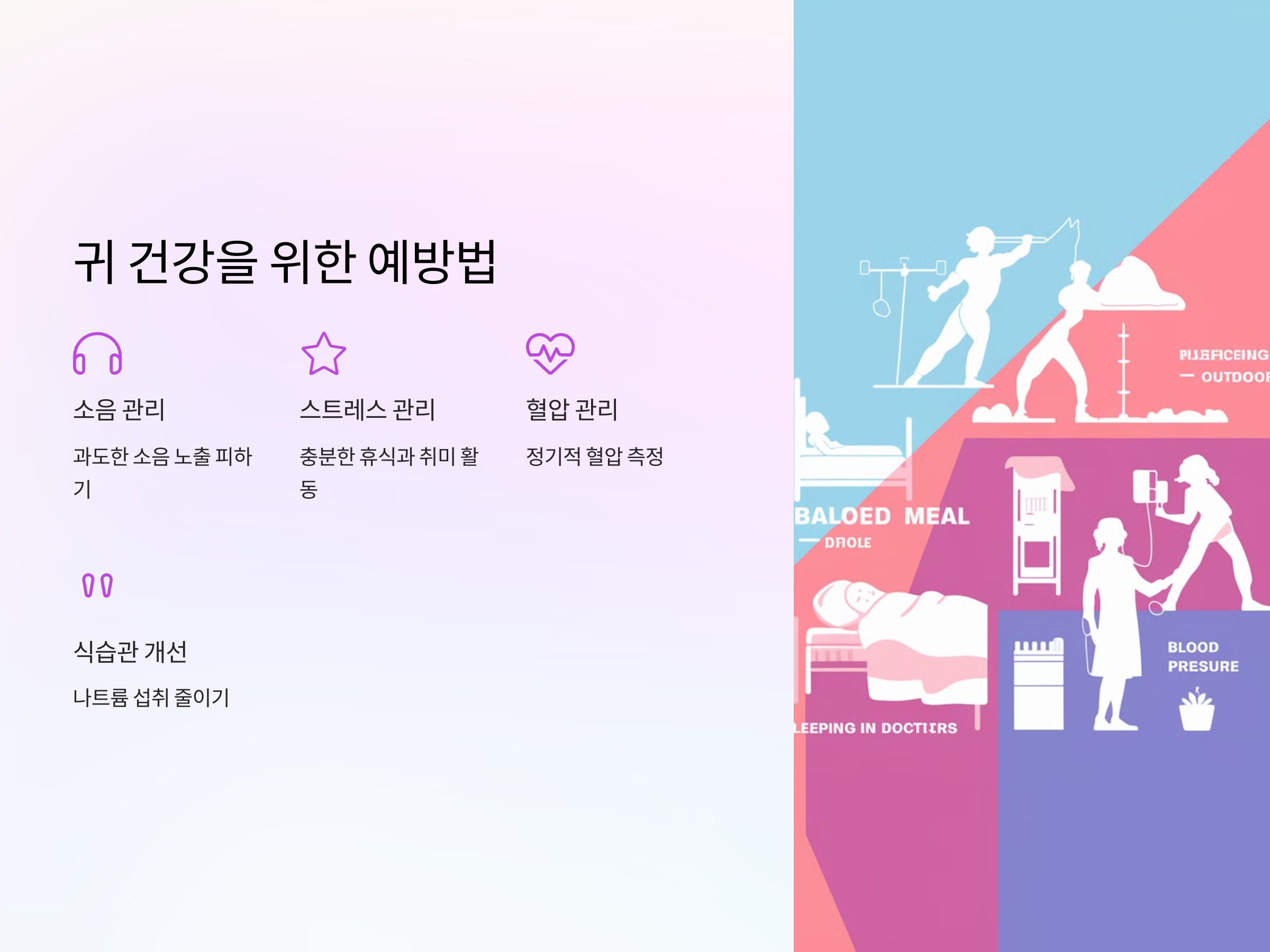 귀 건강을 위해 가장 중요한 점은 예방입니다. 이명이나 고혈압성 혈관 문제와 같은 귀의 문제를 예방하기 위해서는 우선 귀에 과도한 소음이 노출되지 않도록 해야 합니다. 이어폰을 장시간 사용하거나 큰 소리로 음악을 듣는 것은 귀 건강에 해로울 수 있으므로 주의해야 합니다. 또한 스트레스와 과도한 피로도 이명의 주요 원인 중 하나이므로, 적절한 휴식과 취미 생활로 스트레스를 관리하는 것이 중요합니다.