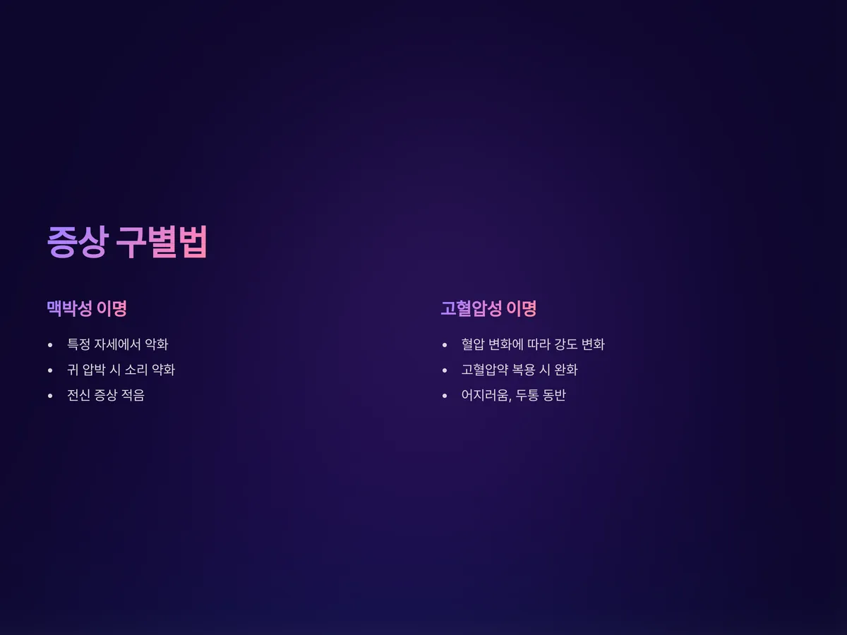 또한 고혈압성 이명은 어지러움, 두통, 가슴 두근거림과 같은 전신 증상을 동반하는 경우가 많습니다. 반면, 순수 맥박성 이명은 귀 자체의 혈류 이상에 의한 경우가 많아 전신 증상은 적습니다. 하지만 이 모든 구분은 어디까지나 참고사항일 뿐이며, 정확한 진단은 전문 의료기관에서 청력검사, MRI, 혈관 초음파 등을 통해 이루어져야 합니다.