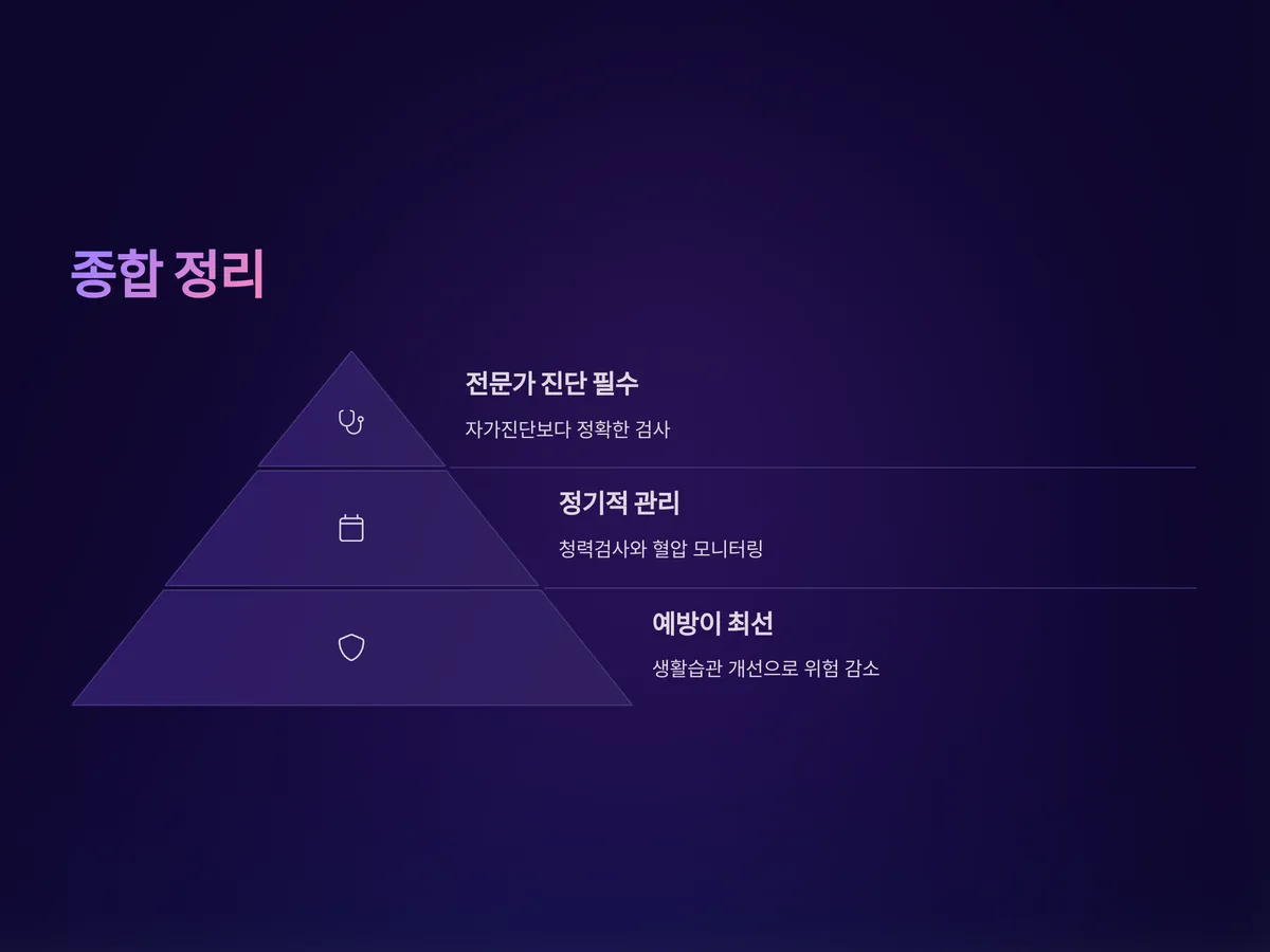 특히 고혈압 병력이 있거나 가족력이 있다면 더욱 조심해야 하며, 정기적인 건강검진과 청력 검사가 필요합니다. 또한 40세 이상이라면 뇌혈관 질환과의 연관 가능성도 배제할 수 없으므로 반드시 종합적인 진료가 필요합니다.