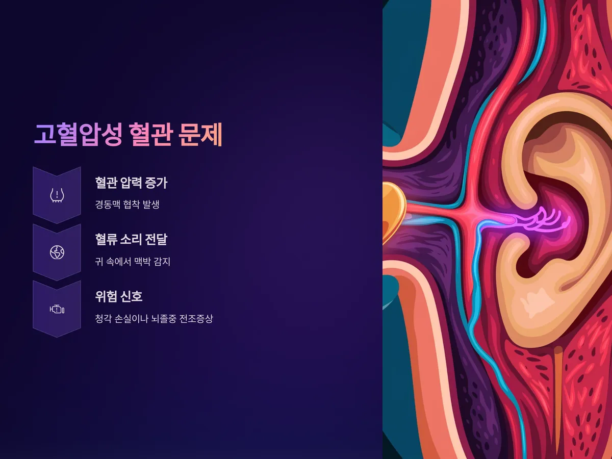 고혈압은 심장과 혈관에 압력을 증가시켜 여러 합병증을 유발할 수 있는데, 그 중 하나가 바로 청각계 혈관의 압박입니다. 특히 고혈압이 지속되면 경동맥의 협착이나 탄력 저하로 인해 혈류 소리가 귀 안으로 전달될 수 있습니다. 이때 들리는 소리가 바로 ‘맥박성 이명’으로 감지되며, 환자는 심장 박동과 동일한 리듬의 소리를 귀 속에서 경험하게 됩니다.