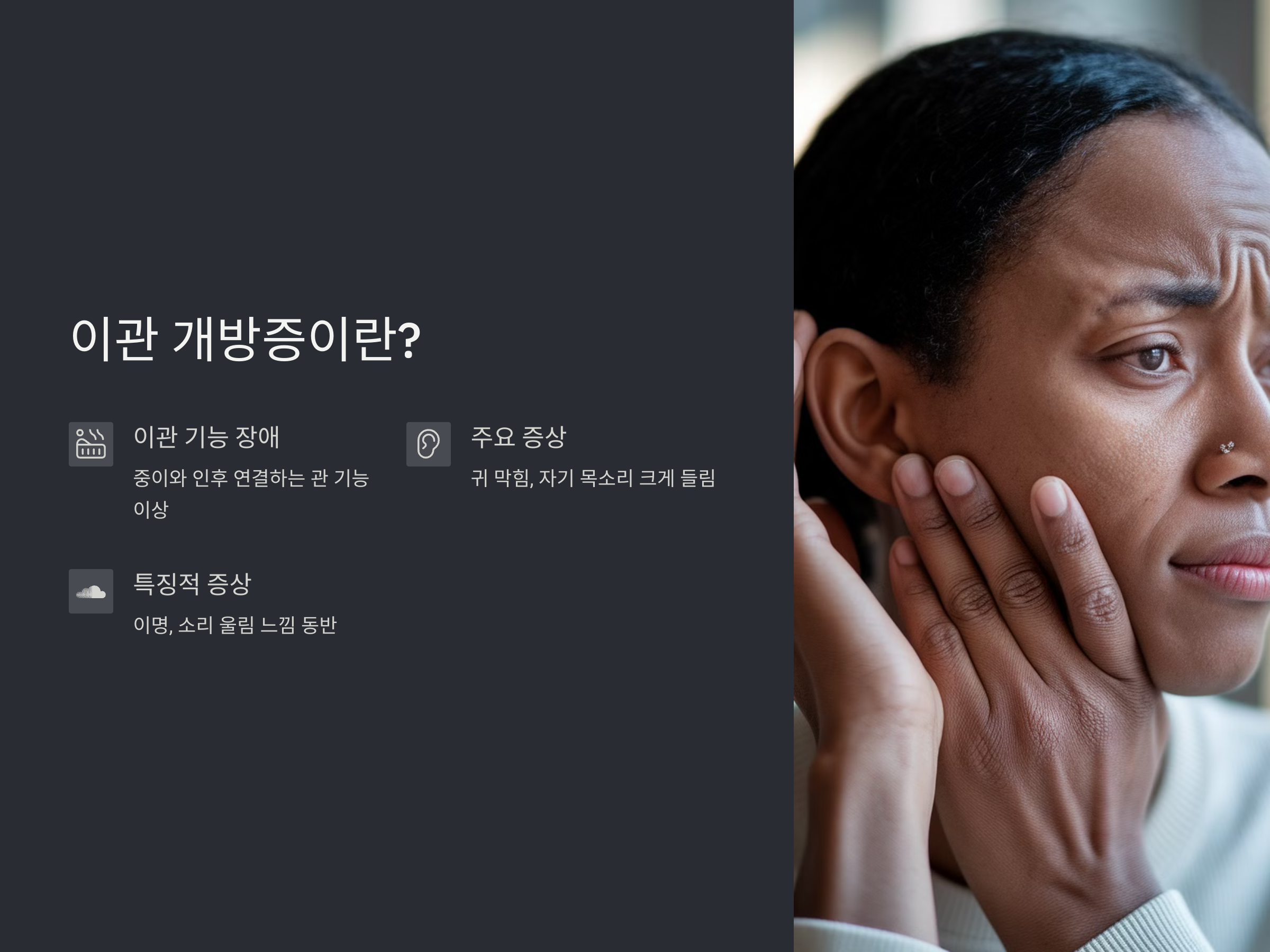 이관 개방증(Eustachian tube dysfunction)은 중이와 인후를 연결하는 이관(Eustachian tube)이 정상적으로 기능하지 않거나 열려 있는 상태를 말합니다. 이 상태에서는 중이와 외부의 압력이 제대로 조절되지 않아 귓속이 꽉 찬 느낌을 유발할 수 있습니다.